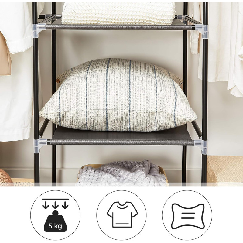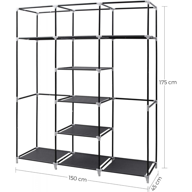 Adancimea articolului: 45 centimetri Despre acest articol Datorita tuburilor metalice cu grosimea de 16 mm de pe fiecare raft si a conectorilor din plastic duplex, capacitatea de incarcare poate ajunge la 5 kg pe fiecare raft. Bara de 0,4 mm grosime suporta 15 kg.Acest dulap este echipat cu o husa din material textil cu fermoar si catarame pentru a depozita hainele in mod corespunzator.Nu sunt necesare unelte, trebuie doar sa instalati tuburile si conectorii. Acum puteti pune in functiune acest dulap de haine.