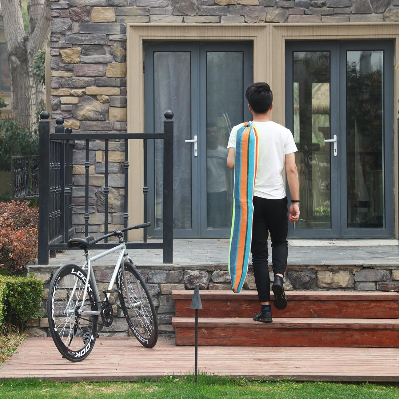 Max. capacitate de incarcare: 300 kg Despre acest articol Fabricat din 70% bumbac + 30% poliester, cu densitatea de 380g/㎡, acest hamac de camping este respirabil si absoarbe transpiratia.Cu capetele nodurilor lucrate manual, acest articol este frumos si durabil. Adoptand procesul special de tricotare, franghiile de bumbac pot suporta o distributie uniforma a greutatii, capacitatea portanta poate ajunge la 300 kg, acest articol are o durata lunga de viata.Dimensiune: 210 x 150 cm, acest hamac in aer liber este suficient de lat si de rezistent pentru a se potrivi confortabil cu doua persoane. Il puteti imparti cu persoana iubita pentru un pui de somn la soare. Pernele sunt un plus minunat.Cu elemente usor de montat, acest pat balansoar este potrivit pentru utilizare in interior sau in exterior. Atasat cu o geanta de transport, este convenabil de transportat. Este destul de usor de curatat si poate fi spalat manual la 30 ℃ fara decolorare.