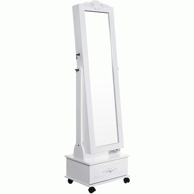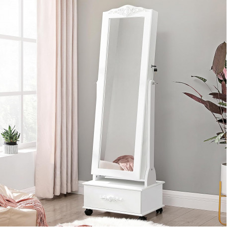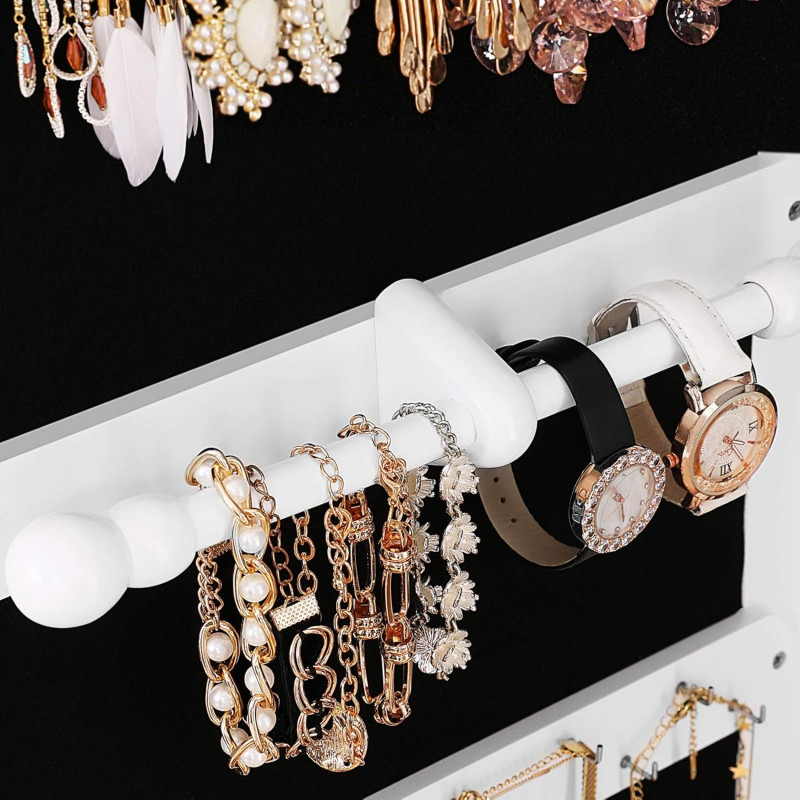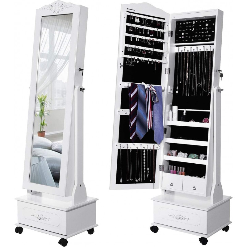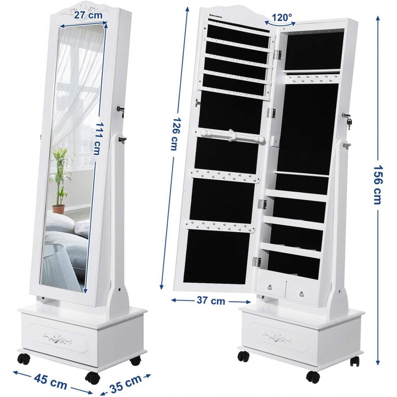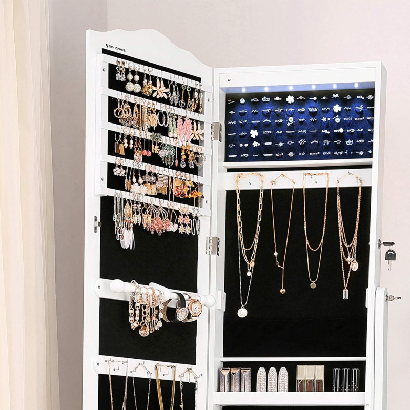Scurta descriere: Dulapul pentru bijuterii SONGMICS imbina eleganta cu functionalitatea, oferind un spatiu amplu si bine organizat pentru toate accesoriile tale. Oglinda integrata cu iluminare LED faciliteaza utilizarea zilnica, iar rotile permit mutarea usoara in orice colt al camerei. Sistemul de inchidere asigura protectia bijuteriilor valoroase.