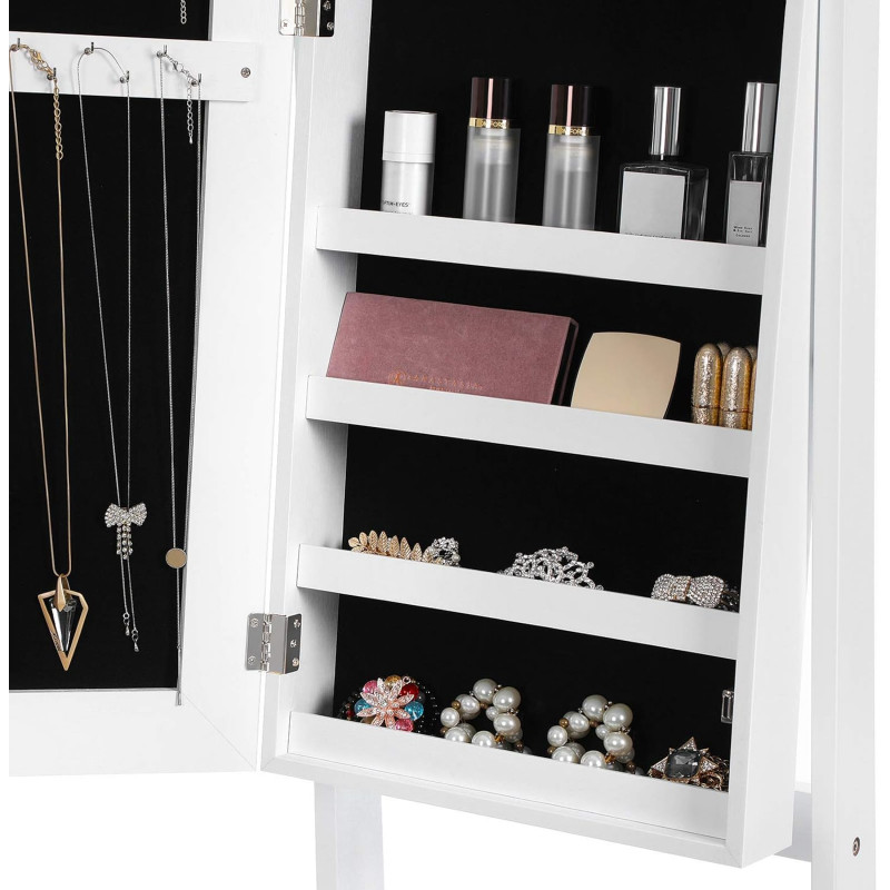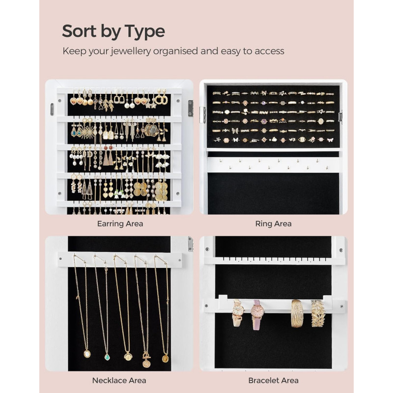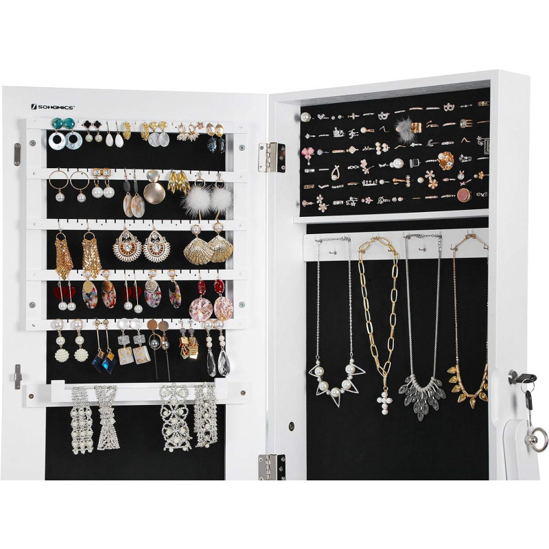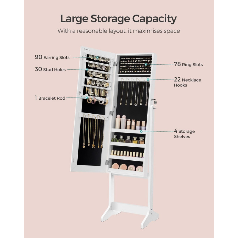 Spatiu de depozitare: In interiorul dulapului cu oglinda exista mult spatiu pentru bijuteriile dvs. - 90 de sloturi pentru cercei, 30 de gauri pentru crampoane, 78 de sloturi pentru inele, 22 de carlige pentru coliere si 4 rafturi pentru alte accesorii.