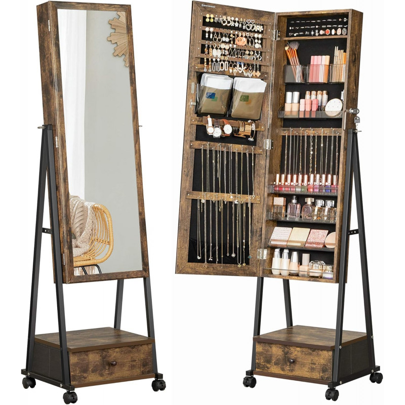 Spatiu de depozitare: Cu 92 de locasuri pentru cercei, 36 de locasuri pentru inele, 1 locas pentru bratari si 32 de carlige pentru coliere, acest dulap pentru bijuterii pastreaza colectia ta de bijuterii in continua crestere. Chiar si pentru cosmetice si multe altele: Doua pungi pentru masti faciale, o tava pentru perii cu 3 fante, o tava pentru rujuri cu 10 fante si 4 rafturi in interiorul dulapului ascund toate secretele tale de frumusete. Un raft si un sertar dedesubt gazduiesc genti sau carti.