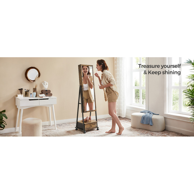 Usor de transportat: Umpleti-l, mutati-l, blocati-l in loc, verificati-va tinuta cu oglinda mare, pe toata lungimea. Puteti glisa cu usurinta acest dulap pentru bijuterii cu 4 roti dintr-o camera in alta si il puteti bloca in loc in timp ce va pregatiti pentru o iesire.