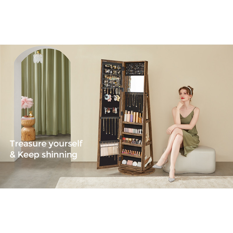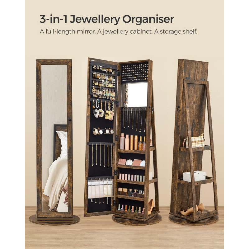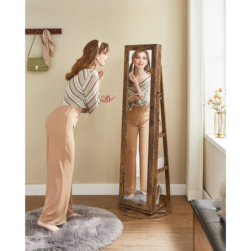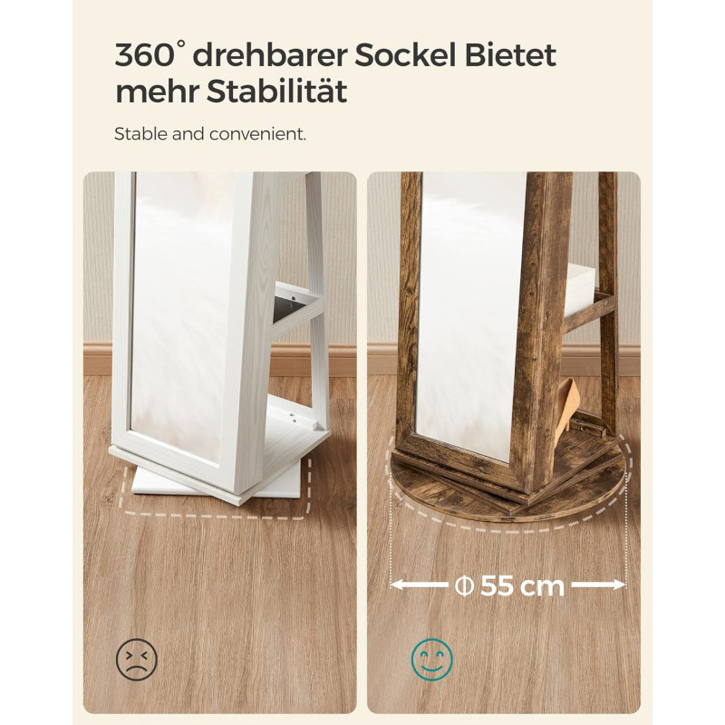 Greutatea produsului: 21,4 kg Despre acest articol Organizator de bijuterii 3 in 1: Cu o oglinda pe toata lungimea de 26 x 144 cm, un dulap pentru bijuterii si un raft de depozitare pe 3 niveluri, acest organizator va pastreaza bijuteriile, machiajul si gentile intr-un singur loc si va ofera o vizualizare rapida de la cap la picioare.Cu 90 de sloturi pentru cercei, 30 de gauri pentru crampoane, 6 carlige pentru bratari, 2 tije pentru bratari, 24 de carlige pentru coliere, 91 de sloturi pentru inele si 5 rafturi, totul are locul sau in acest dulap de depozitare a bijuteriilor - fara mizerie si incurcaturi!Intoarceti dulapul pentru bijuterii pentru a va verifica tinuta din unghiuri diferite sau intoarceti-l spre spate pentru a avea acces usor la articolele de pe raftul din spate - cu o baza pivotanta mare de 360° cu diametrul de 55 cm, acesta se roteste stabil si fara probleme.Acest organizator de machiaj vine cu o oglinda mare in interior, astfel incat sa puteti alege si verifica rapid bijuteriile sau machiajul fara a deschide si inchide in mod repetat usa dulapului.Confectionat din MDF de calitate si catifea moale la atingere, plus un design blocabil, acest dulap pentru bijuterii este solid la exterior si moale la interior, astfel incat bijuteriile dvs. vor fi bine protejate si ingrijite.