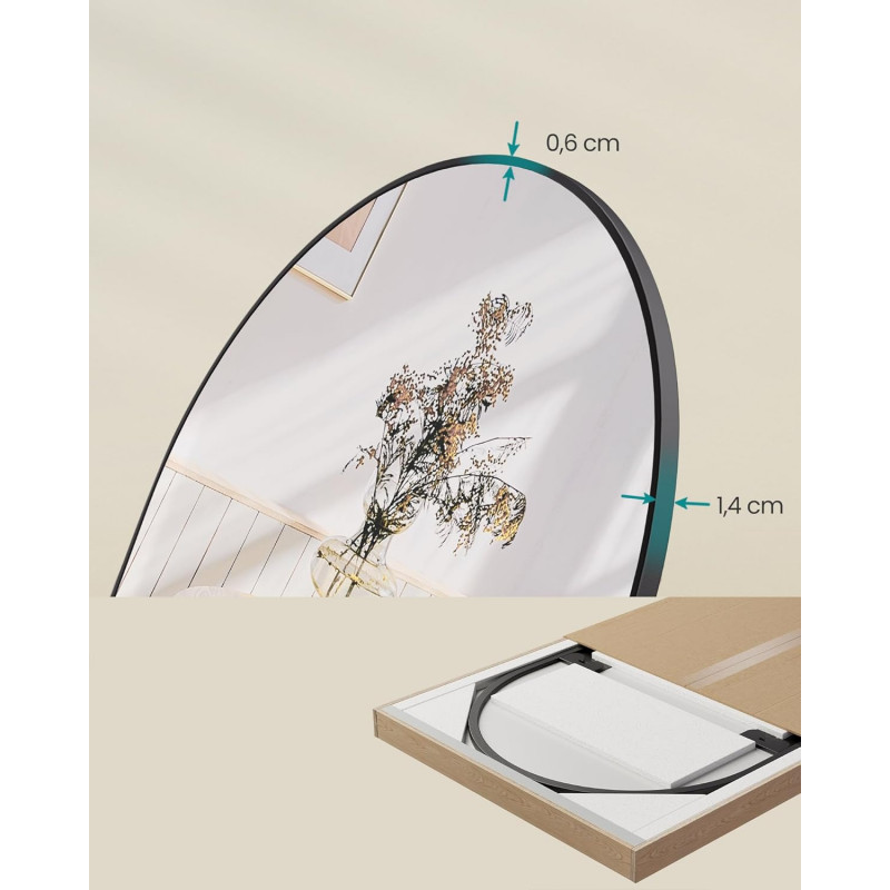 Scurta descriere: Aceasta oglinda SONGMICS cu rama curbata din aluminiu imbina eleganta si siguranta. Oglinda de 120x40 cm ofera o reflectie intreaga a tinutei si se monteaza usor pe perete sau pe usa. Sticla securizata si filmul de siguranta asigura protectie suplimentara in caz de spargere accidentala.