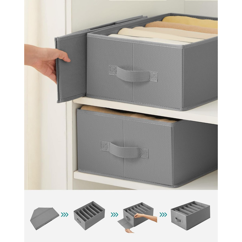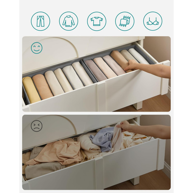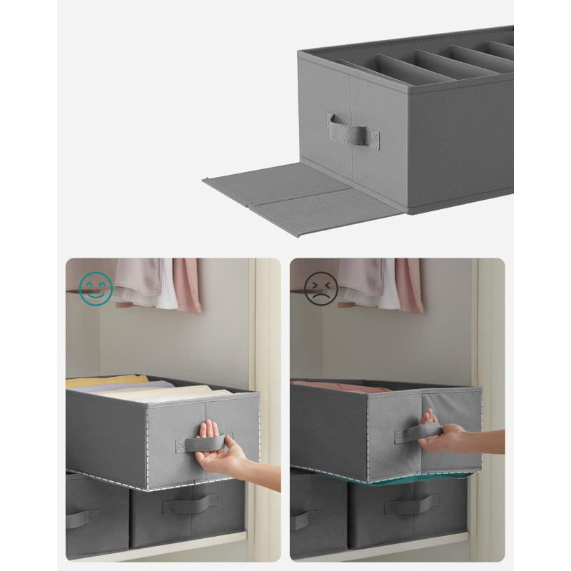 Scurta descriere Setul de organizatoare pentru dulap este ideal pentru mentinerea ordinii in sertare sau rafturi. Fiecare cutie are 6 compartimente care permit separarea eficienta a hainelor, pantalonilor sau accesoriilor. Designul pliabil si stivuibil ajuta la economisirea spatiului si organizare optima.