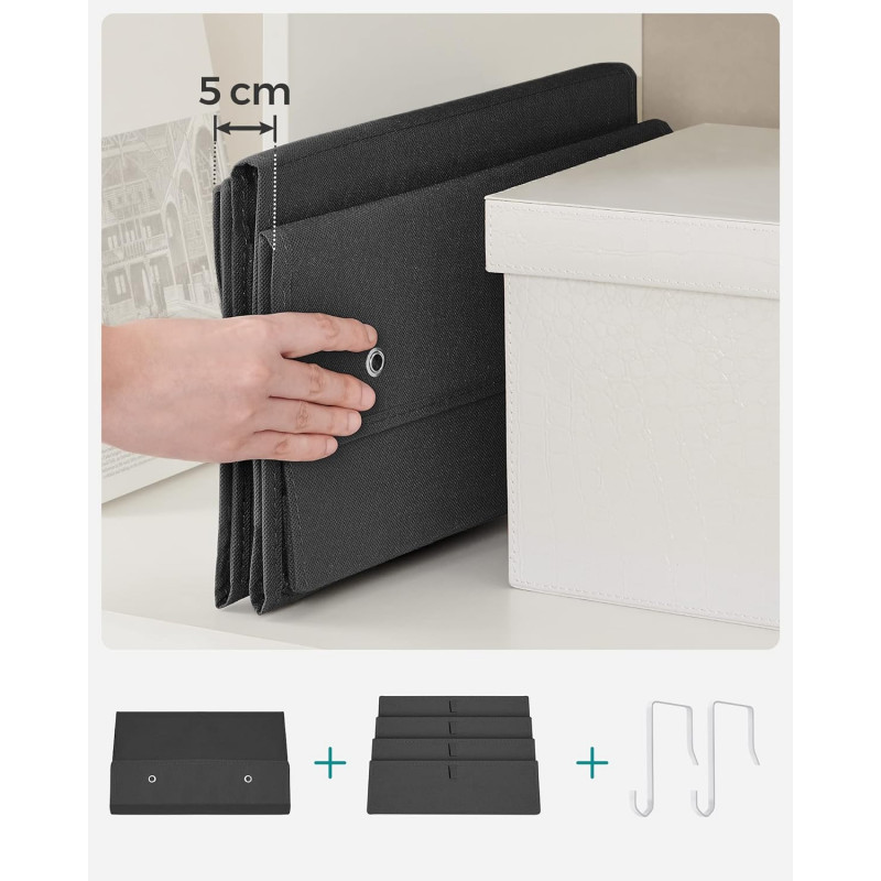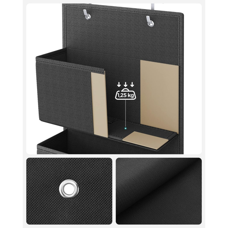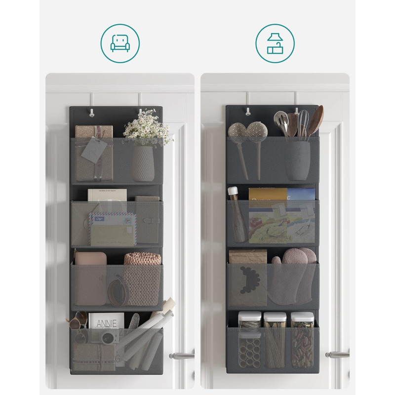 Capacitate maxima de incarcare statica: 5 kg Despre acest articol Cu 4 buzunare de 10 x 32 x 17 cm, acest raft suspendat maximizeaza spatiul ascuns in spatele usii.Cele 4 buzunare cu inaltimea de 17 cm sunt ideale pentru depozitarea scutecelor in camera copilului, a sticlelor in baie, a sosetelor si lenjeriei de corp in dormitor si a diferitelor accesorii in bucatarie.Acest spatiu de depozitare suspendat este fabricat din tesatura netesuta de 80 g/m2. Partea din fata, partea de jos si spatele sunt intarite cu carton, fiecare punga suporta pana la 1,25 kg, capacitatea totala de incarcare 5 kg.Carligele sunt potrivite pentru usi cu o grosime mai mica de 4,5 cm, iar capetele curbate previn caderea raftului. Carligele nu interfereaza cu deschiderea si inchiderea usilor.Cand acest raft suspendat nu este utilizat, este suficient sa scoateti carligele si cartoanele si sa il pliati pentru a economisi spatiu.