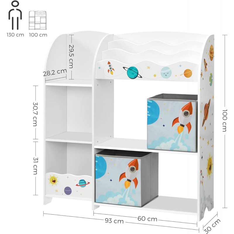 Organizarea conteaza: Daca le spui copiilor tai ca jucariile lor merita o casa ordonata, in sfarsit, acest organizator de jucarii ii va atrage sa invete cum sa organizeze totul. In timp, ii poate ajuta chiar sa se pregateasca pentru scoala.Carti, jucarii, bibelouri: Ce mai are copilul tau? Lasa-le pe toate aici-3 compartimente spatioase pentru carti, 3 cuburi si un compartiment mare pentru jucarii de plus, 2 sertare din material textil pentru blocuri de constructie si alte bibelouri.Stabilitatea inainte de orice: Aceasta unitate de depozitare pentru copii are colturile rotunjite pentru a va proteja copilul de lovituri si vanatai;Atingere decorativa: Minunatul organizator de jucarii si carti cu autocolante insenineaza spatiul copiilor; rachetele, asteroizii si stelele aduc entuziasmul pentru explorare in viata si imaginatia lor.