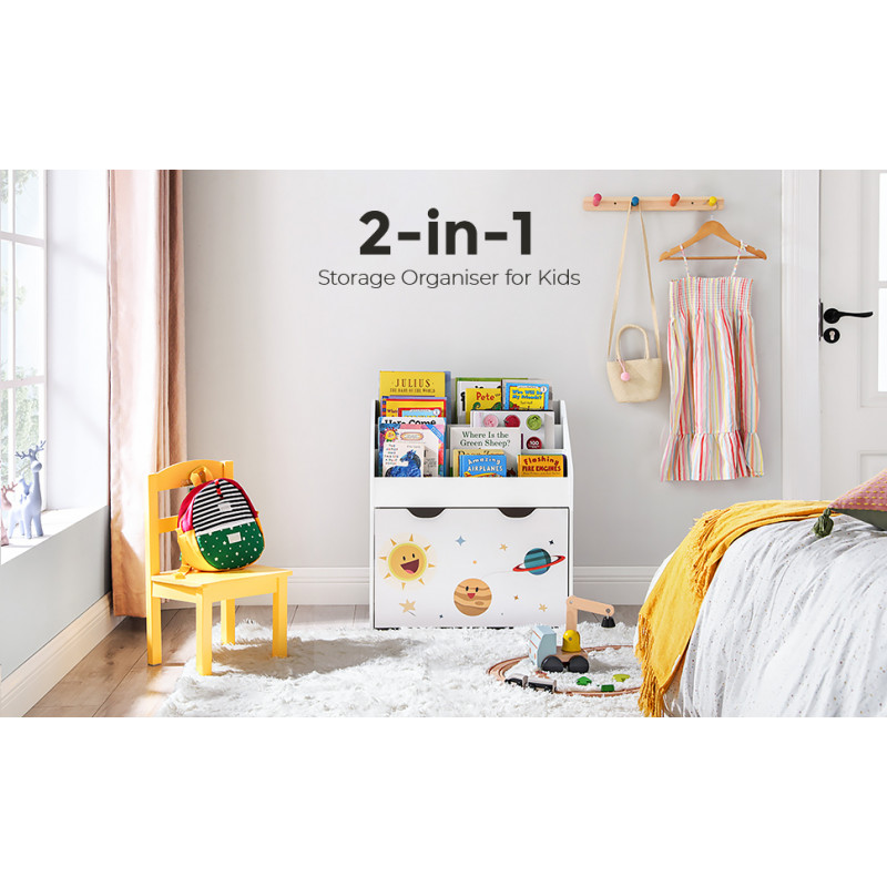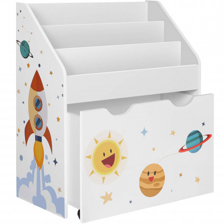 Greutatea produsului: 13,7 kg Despre acest articol 3 rafturi deschise in partea de sus il vor ajuta pe micutul dvs. sa isi alinieze cartile preferate de diferite dimensiuni, iar o cutie de jucarii cu roti ii permite sa o scoata pentru a-si gasi colectia de jucarii.Conceput pentru cei mici, acest organizator de jucarii are o inaltime ideala pentru a-i ajuta pe copii sa aduca cu usurinta obiectele; manerele sculptate permit o tragere usoara; colturile rotunjite si un kit anti-inclinare adauga siguranta.MDF-ul de inalta calitate si panoul de particule de calitate E1 cu care este construit acest raft de carti pentru copii il fac stabil, usor de curatat si un punct luminos in dormitorul micutului dvs. pentru anii urmatori.Cu