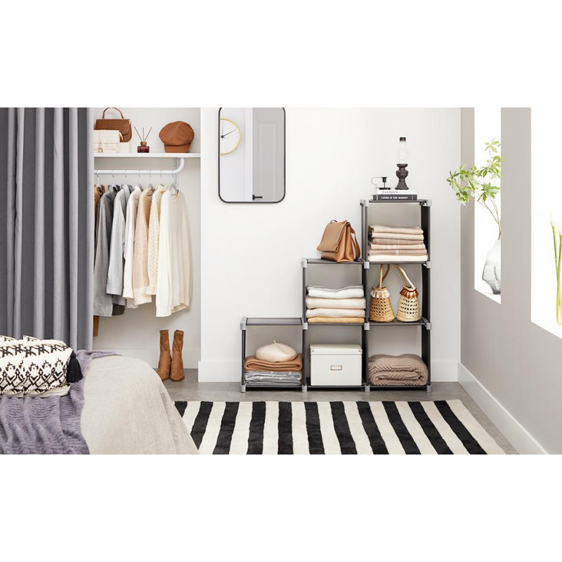 Se potriveste in majoritatea camerelor: toti conectorii din plastic pot fi utilizati pe ambele parti si sunt realizati intr-o dimensiune uniforma, permitandu-va sa construiti si sa extindeti acest raft in functie de necesitati.Tuburile metalice ofera rafturilor din tesatura o fixare stabila, iar elementul din tesatura ofera cadrului metalic o atingere calda. Acest raft este, de asemenea, usor de transportat datorita materialelor sale usoare.Fara teama de asamblare: stim ca asamblarea unei piese de mobilier nu este o distractie populara. Prin urmare, acest raft este proiectat cu tuburi de dimensiuni uniforme (Ø 12 mm), ceea ce face asamblarea mai usoara; nu sunt necesare unelte.