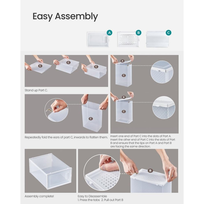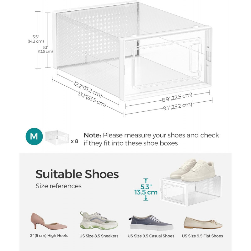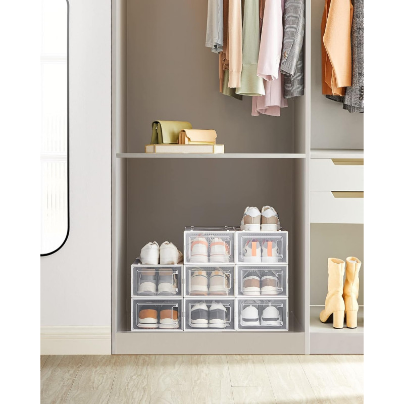 Scurta descriere: Setul SONGMICS cu 8 cutii pentru pantofi este solutia ideala pentru organizarea eficienta a incaltamintei. Designul transparent permite vizualizarea rapida a continutului, iar structura stivuibila ajuta la economisirea spatiului. Perfect pentru orice dressing sau hol ordonat.