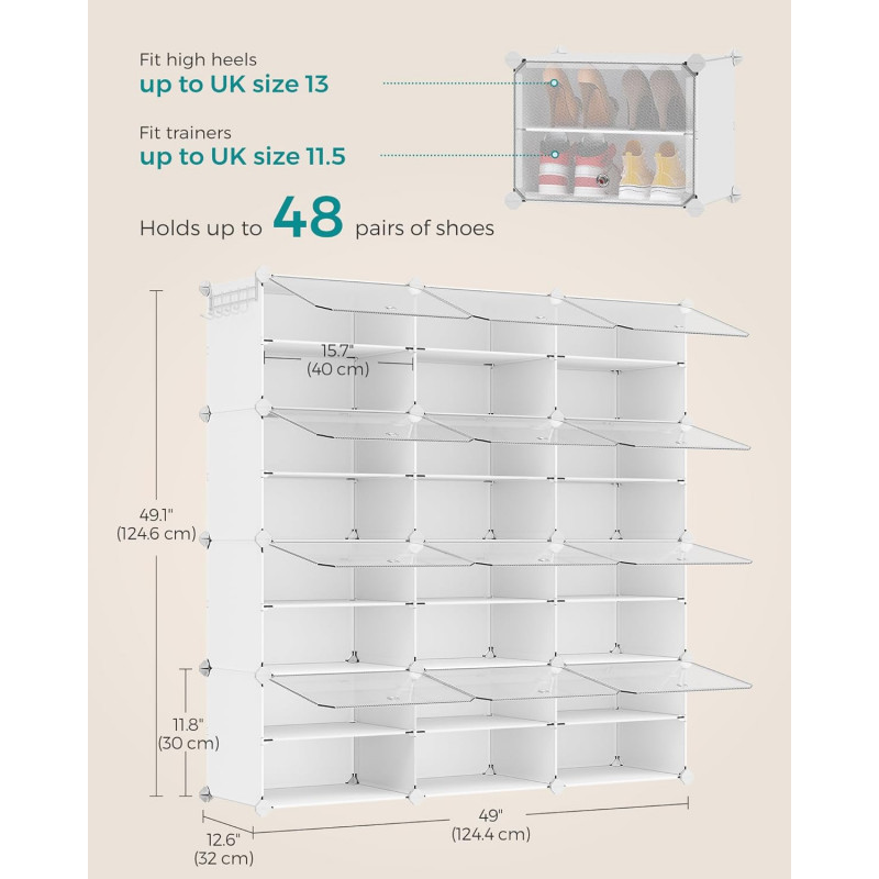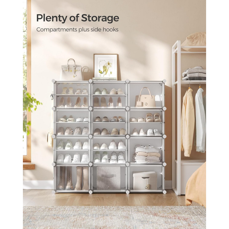 Scurta descriere Dulapul de pantofi SONGMICS cu 12 compartimente ofera o solutie practica pentru organizarea incaltamintei si a accesoriilor. Structura modulara permite configurarea flexibila, iar usile transparente protejeaza continutul de praf, asigurand in acelasi timp ventilarea. Este potrivit pentru hol, dormitor sau zona de intrare.