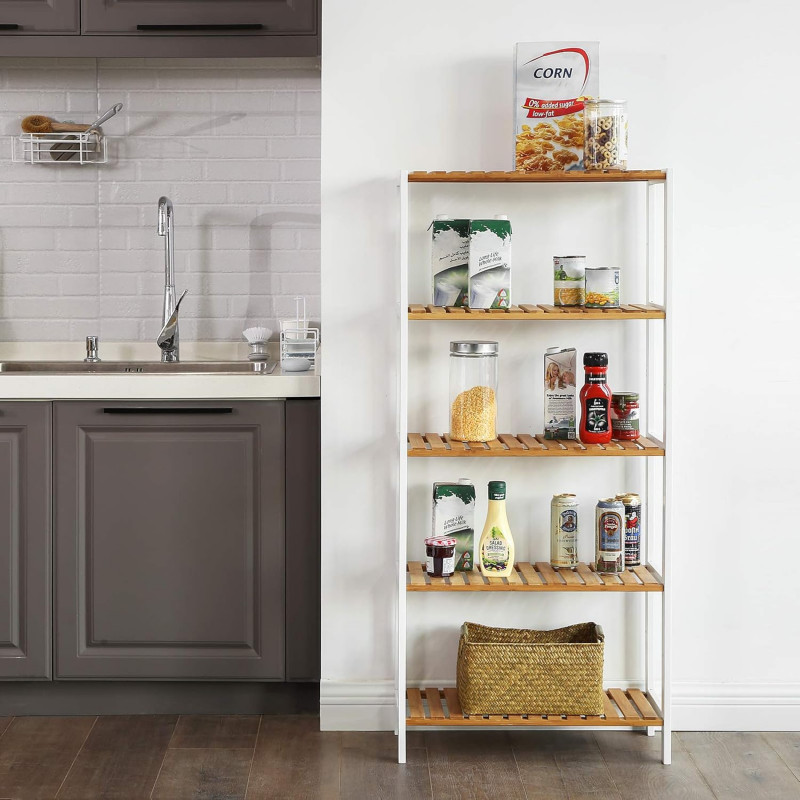 Scurta descriere Etajera cu 5 niveluri realizata din bambus natural, conceputa pentru organizare eficienta in diverse spatii ale locuintei. Designul multifunctional permite utilizarea in baie, hol, bucatarie, living sau balcon. Rafturile ofera stabilitate ridicata si permit scurgerea apei, prevenind deformarea materialului si prelungind durata de utilizare. Structura aerisita adauga un aspect natural si ordonat incaperii.