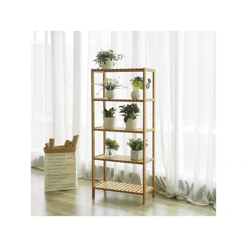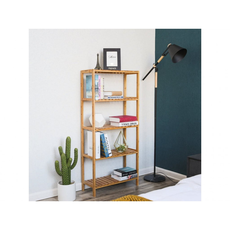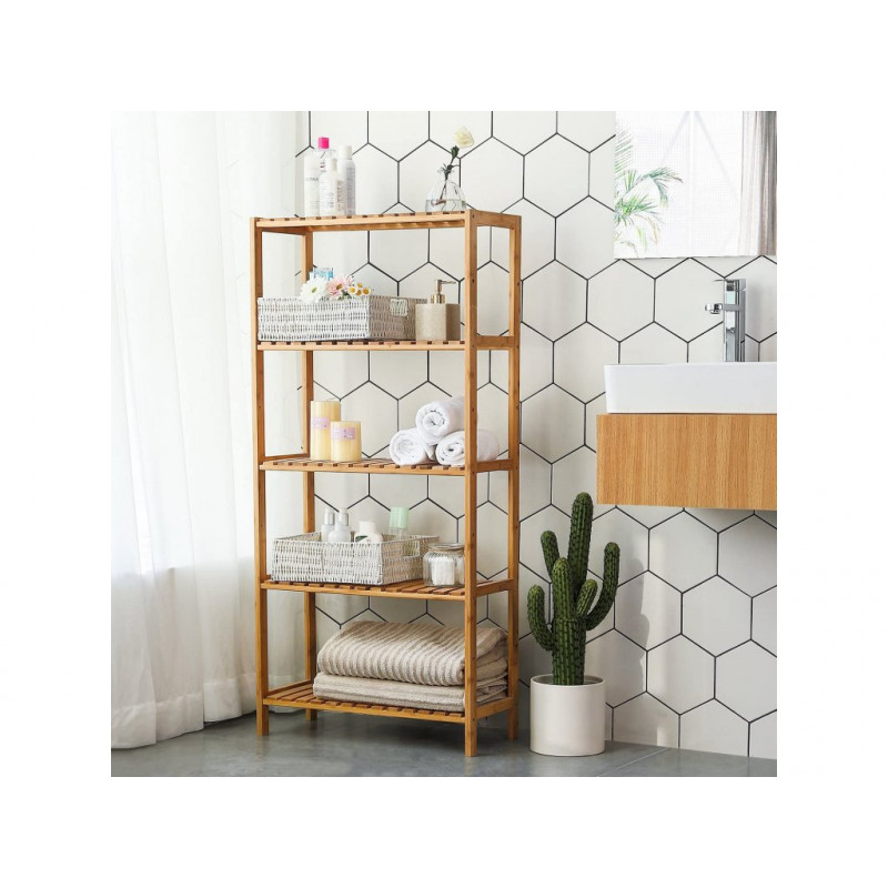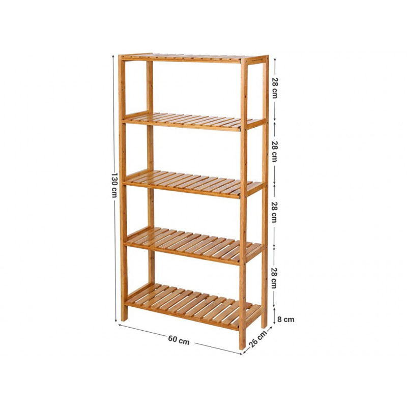 Dimensiunile produsului: 26 D x 130 W x 60 H centimetri Un suport din bambus de care sa te indragostesti: Datorita rafurilor reglabile, tot ce folosesti des in viata de zi cu zi poate fi depozitat ingrijit intr-un singur loc. Acest raft ofera, de asemenea, casei tale o nota moderna si calda.Adaptabil la nevoile dvs.: diferite obiecte, fie ele mici sau mari, pot fi depozitate cu usurinta in acest suport pe picioare, deoarece cele 5 niveluri de rafturi pot fi reglate la 9 inaltimi diferite.Beneficiile bambusului: Acest suport din bambus are mai mult de oferit decat aspectul sau fermecator. Ca materie prima regenerabila, bambusul este adesea folosit ca material pentru mobilier; o alegere perfecta pentru o casa „verde”! (fiecare raft poate sustine pana la 10 kg)Asamblare usoara: Nu trebuie sa fii un expert pentru a configura aceasta polita de baie, deoarece ramele sale laterale constau dintr-o singura piesa odata. Pur si simplu conectati rafturile la ramele laterale si acest raft este configurat.
