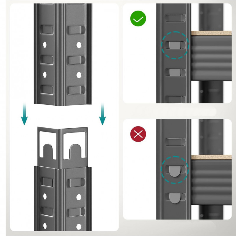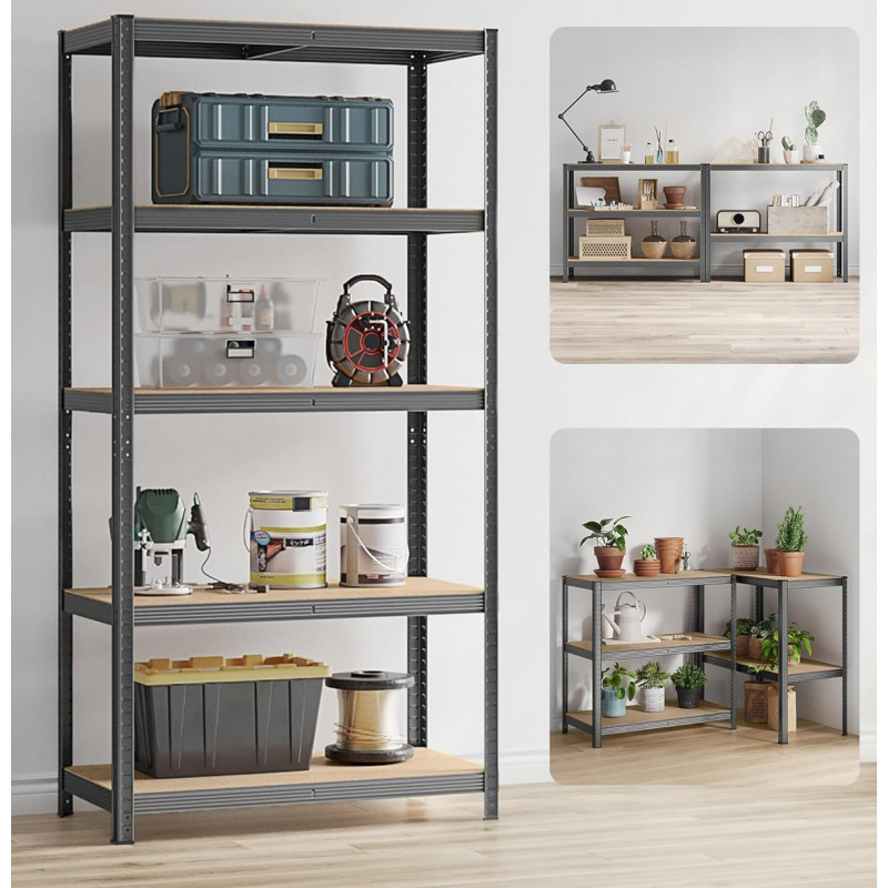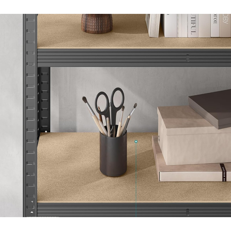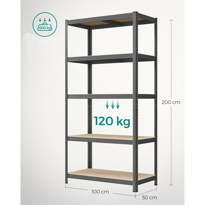 Gama larga de aplicatii Raftul extrem de solid este echipat cu 5 rafturi rezistente, unde fiecare raft poate suporta o sarcina de 125 kg. Nu uitati sa distribuiti greutatea in mod egal pe rafturi! Evitati incarcarea punctiforma pentru a minimiza riscul de defectiune. Datorita reglajului larg al inaltimii rafturilor, puteti crea, de exemplu, 2 rafturi mai mici in loc de unul mare. Aceasta este o solutie excelenta in camerele joase, unde o biblioteca mare nu se potriveste neaparat. Raftul este sigur pentru utilizatorii care il folosesc. Constructia stabila si solida mentine raftul intr-o singura pozitie. Colturile rotunjite exclud posibilitatea de ranire, iar capacele suplimentare din plastic impiedica zgarieturile pe podea.
