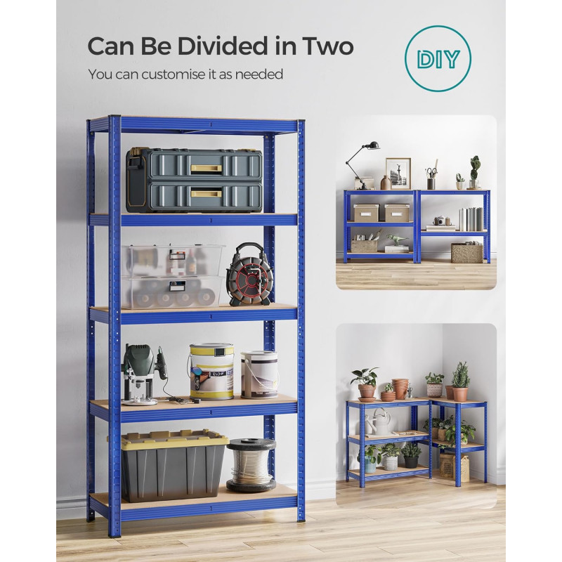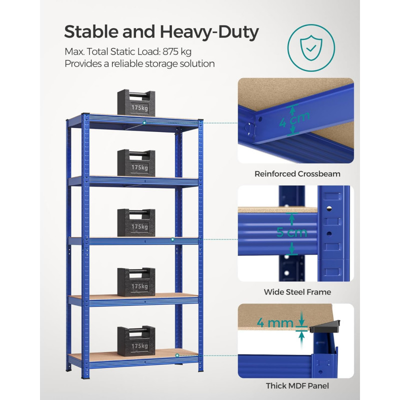 Capacitate de incarcare statica totala: 875 kg Despre acest articol Aceasta unitate de rafturi pentru garaj este realizata cu un cadru din otel, iar fiecare nivel poate sustine pana la 175 kg. Kitul anti-inclinare inclus ajuta la atasarea raftului la perete, facandu-l mai stabil si mai sigur.Aceasta unitate de rafturi metalice poate fi impartita in 2 unitati separate pentru a se potrivi nevoilor dvs. de depozitare si spatiului dvs.; odata impartite, acestea functioneaza, de asemenea, excelent ca bancuri de lucru cu depozitare. Fiecare nivel poate fi ajustat cu usurinta la fiecare 5 cm.Cu dimensiuni de 40 x 90 x 180 cm si o capacitate de incarcare totala de 875 kg, aceasta unitate de rafturi poate fi utilizata intr-un garaj, depozit, pivnita sau camera de utilitate pentru a va organiza toate uneltele si echipamentele.Cu un design cu interblocare si