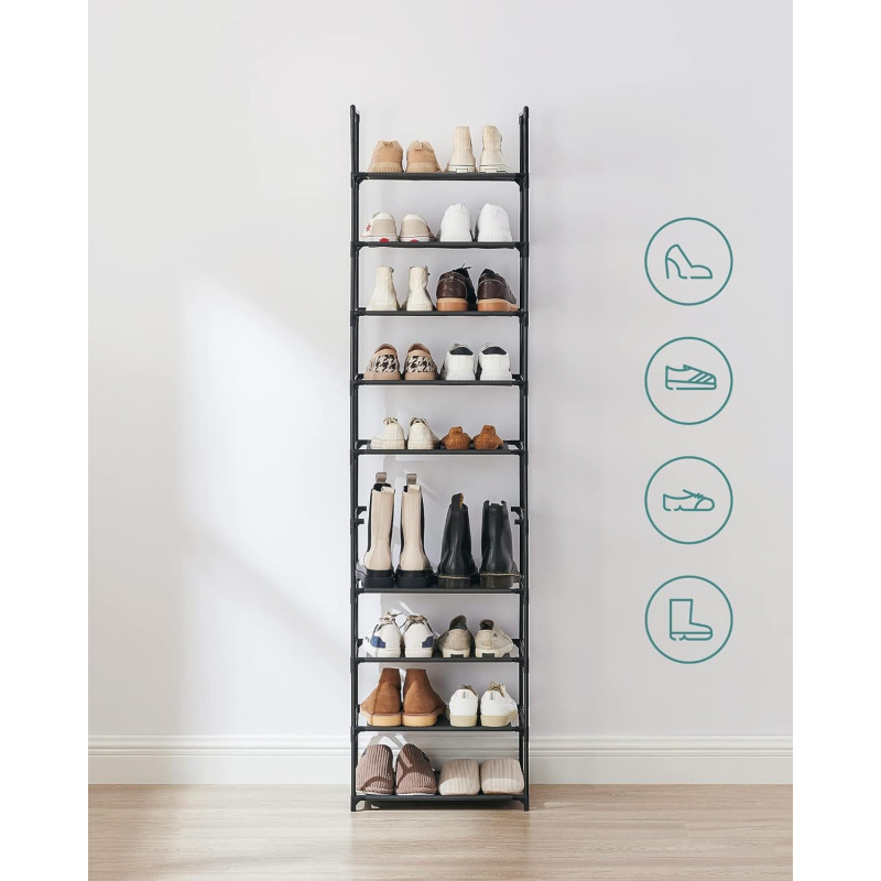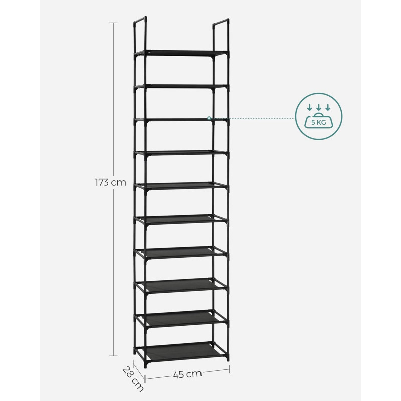 instructiuni usor de citit si piese etichetate pentru o asamblare fara probleme.Acest raft pentru pantofi are o durata de viata lunga! Este fabricat din tuburi metalice rezistente si tesatura netesuta durabila, oferind pantofilor dvs. un suport stabil si fiabil.Cu o dimensiune de 45 x 28 x 173 cm, acest suport pentru pantofi cu 10 niveluri va ajuta sa economisiti spatiu pretios pe podea, oferind in acelasi timp o multime de spatiu de depozitare.Puteti folosi acest suport de pantofi in felul dvs.: impartiti-l in 2 parti si folositi-le in camere separate sau scoateti cateva rafturi pentru a potrivi pantofi sau cizme mai inalte.Acest organizator de depozitare a pantofilor se potriveste perfect in holul dvs., in camera de zi, in dressing, in dormitor sau oriunde aveti nevoie de depozitare suplimentara. Oriunde ati folosi suportul pentru pantofi, acesta va poate pastra intotdeauna pantofii curati si ordonati