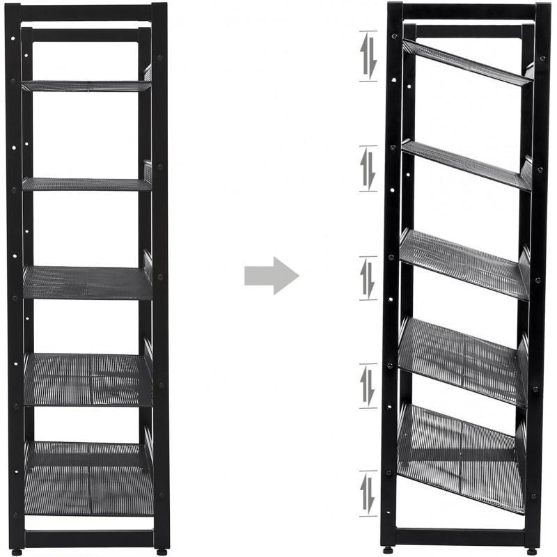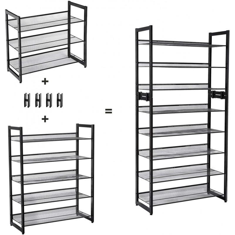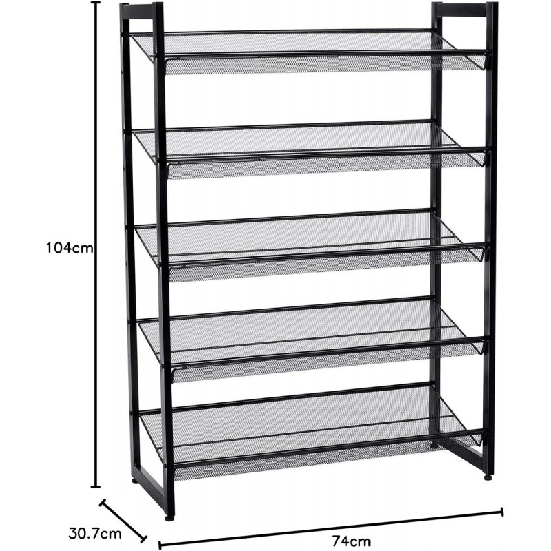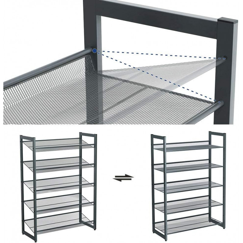 Personabil dupa cum aveti nevoie: Puteti alege sa asamblati rafturile plat sau inclinat pentru un acces mai usor la pantofi. De asemenea, puteti stivui 2 suporturi pentru spatiu suplimentar de depozitare. Pantofii mai inalti se potrivesc, de asemenea: Puteti elimina un nivel pentru a se potrivi cu cizme si mai inalte. 5 niveluri, gazduieste 15-20 perechi: Acest organizator de pantofi cu 5 niveluri poate tine 3 perechi de pantofi pentru barbati sau 4 perechi de pantofi de dama pe fiecare nivel, oferind o casa pentru pantofii tai de zi cu zi.