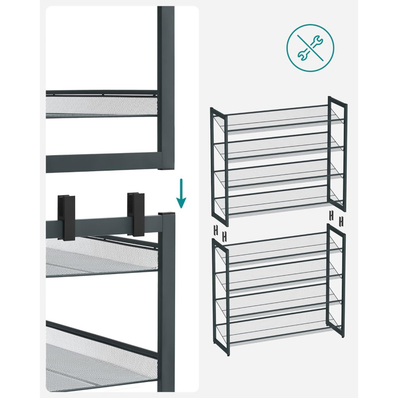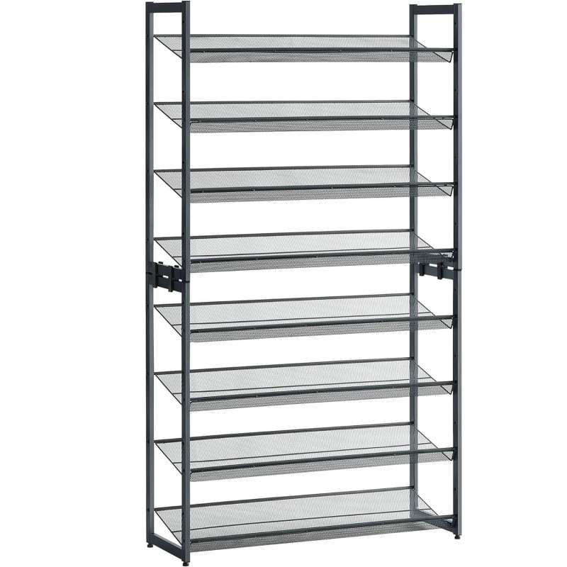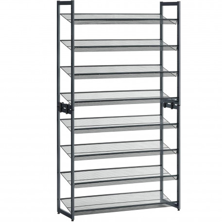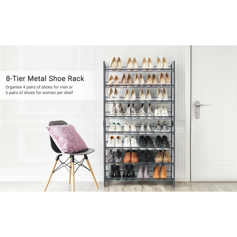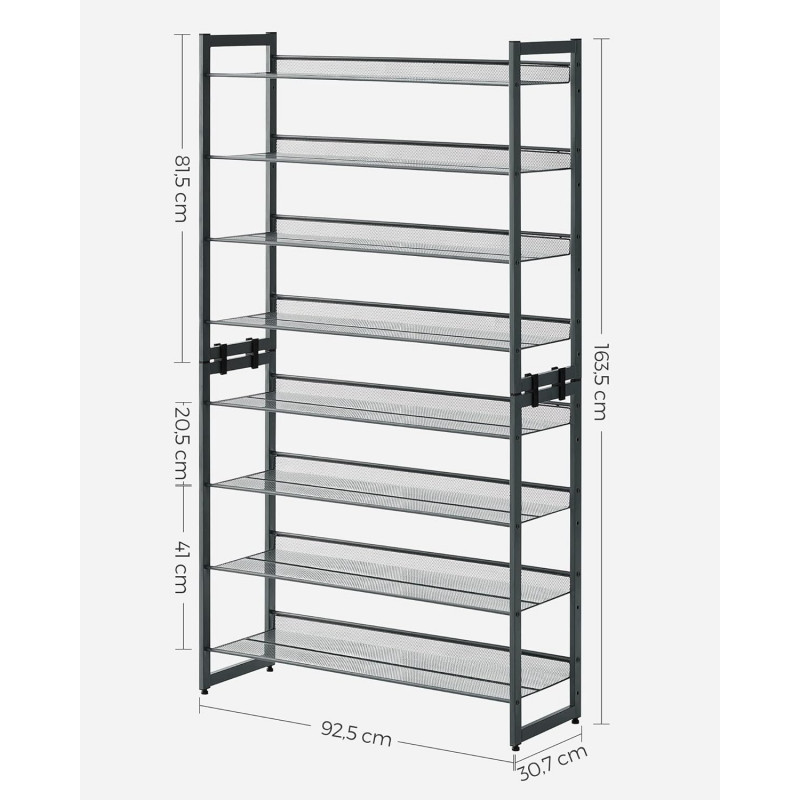 Capacitatea de incarcare a fiecarui nivel: 10 kg Despre acest articol Puteti alege sa asamblati rafturile plate sau in unghi pentru un acces mai usor la pantofi. De asemenea, puteti alege sa impartiti raftul inalt pentru pantofi in 2 rafturi separate cu 4 niveluri pentru camere diferite sau sa le pastrati stivuite ca un raft cu 8 niveluri.Cu un spatiu amplu intre rafturi, tocurile inalte si adidasii cu varf inalt isi pot gasi un loc perfect aici, pe acest raft pentru pantofi. Sau, puteti indeparta un nivel pentru cizme si mai inalte.Acest organizator de pantofi cu 8 niveluri poate tine 4 perechi de pantofi de barbati sau 5 perechi de pantofi de femei pe fiecare nivel, oferind un loc pentru toti pantofii dvs.Cu un cadru metalic puternic si rafturi din plasa densa, acest raft de depozitare a pantofilor este construit pentru a dura. Chiar mai bine, vine cu picioare reglabile pentru a-l mentine stabil chiar si pe podele inegale.Acest raft metalic pentru pantofi vine cu piese numerotate si