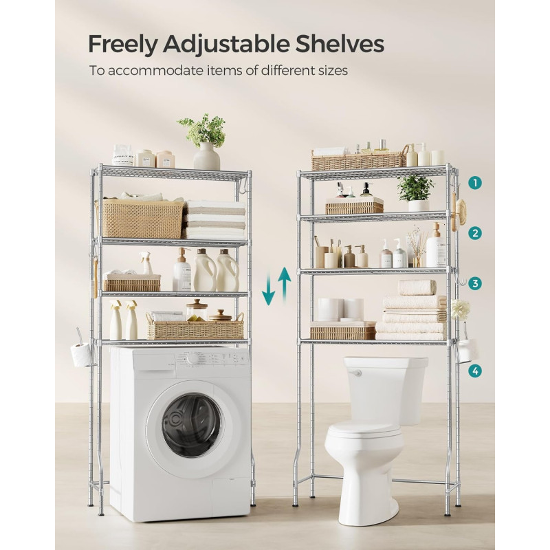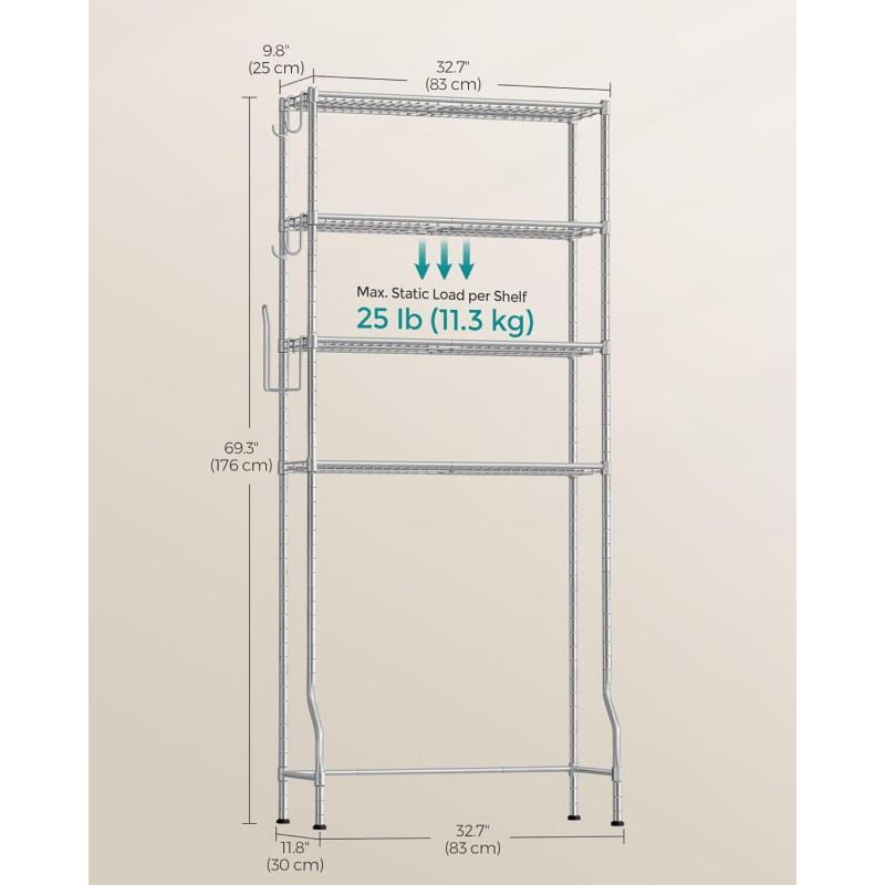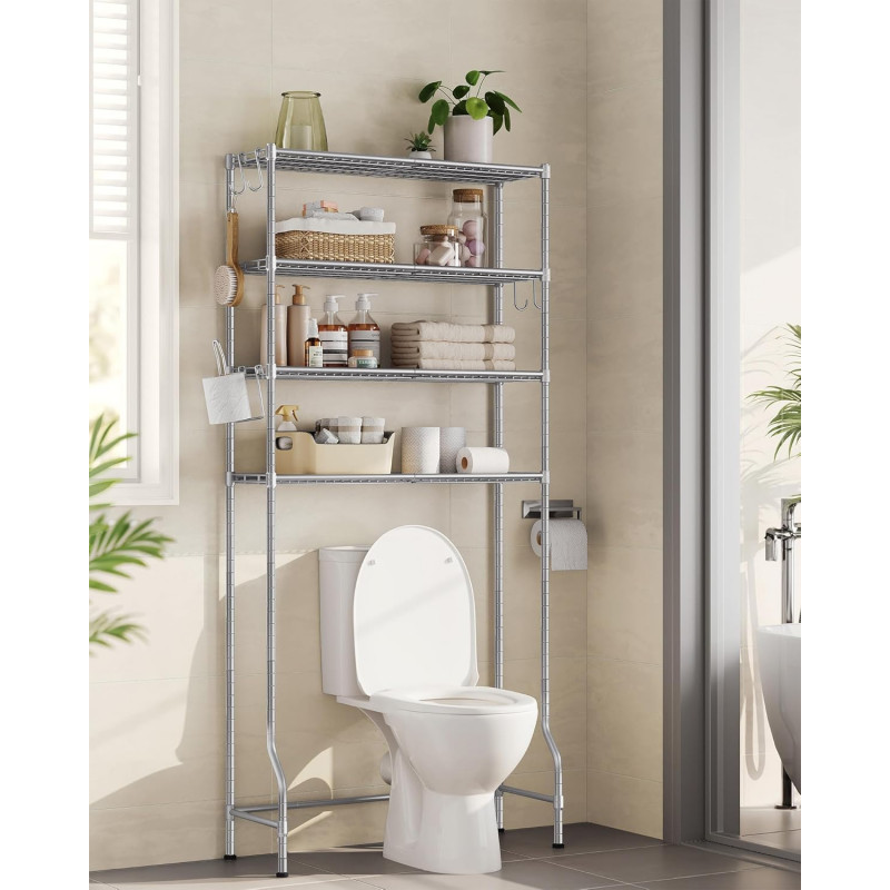 Max. Capacitate de incarcare statica pe nivel: 11,3 kg Despre acest articol Conceput pentru a valorifica spatiul neutilizat de deasupra toaletei sau a masinii de spalat, acest raft spatios de depozitare pe 4 niveluri ofera spatiu suficient pentru articolele de toaleta si articolele esentiale de spalat, contribuind la o baie senina si ordonata.Acesta vine cu un suport pentru role si 4 carlige convenabile, oferind un loc desemnat pentru hartia igienica si articolele mai mici, imbunatatind functionalitatea spatiului dvs. de baie.Cu 4 rafturi ajustabile, acest raft de depozitare pentru baie este perfect pentru depozitarea articolelor de inaltimi diferite, de la sticle de sampon la prosoape, raspunzand nevoilor dvs. unice de depozitare.Raftul inferior reglabil al acestui suport pentru baie asigura lipsa interferentelor cu capacul toaletei, in timp ce barele inferioare reglabile se potrivesc unei varietati de modele de toalete pentru confort. Acest raft metalic peste toaleta este proiectat cu un fund marit pentru o stabilitate sporita, cuplat cu picioare reglabile pentru a asigura un echilibru perfect. Asamblarea acestui raft este foarte simpla. Nu este nevoie de suruburi sau chei. Pur si simplu imbinati piesele clar etichetate conform