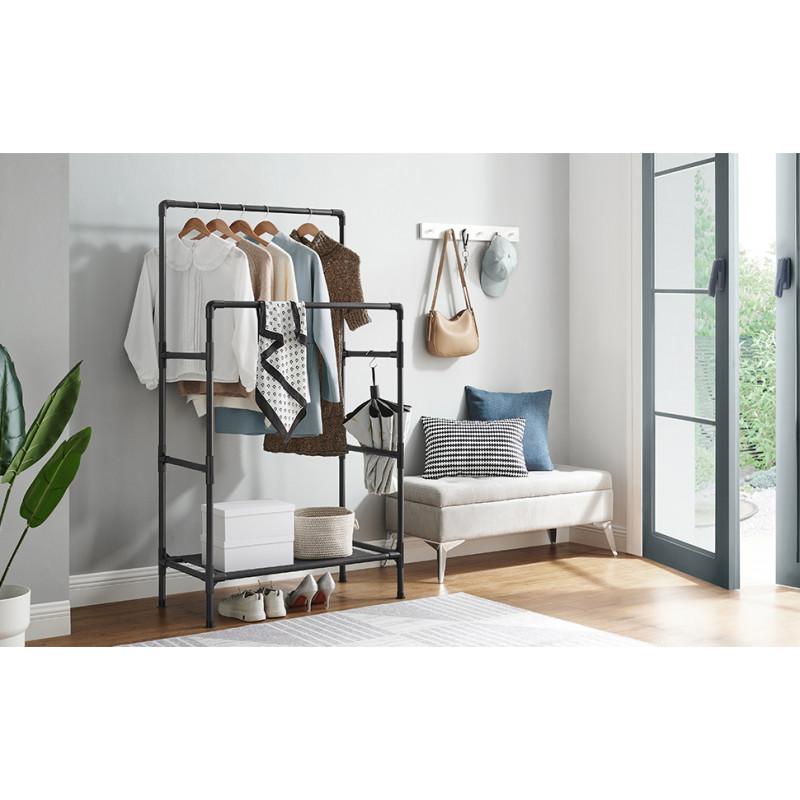 Scurta descriere: Suportul pentru haine SONGMICS cu 2 bare este solutia practica pentru organizarea eficienta a hainelor in dormitor, hol sau dressing. Structura din otel ofera stabilitate si rezistenta, suportand pana la 55 kg. Cele doua bare permit separarea articolelor lungi de cele scurte, iar raftul inferior este ideal pentru pantofi sau cutii de depozitare.