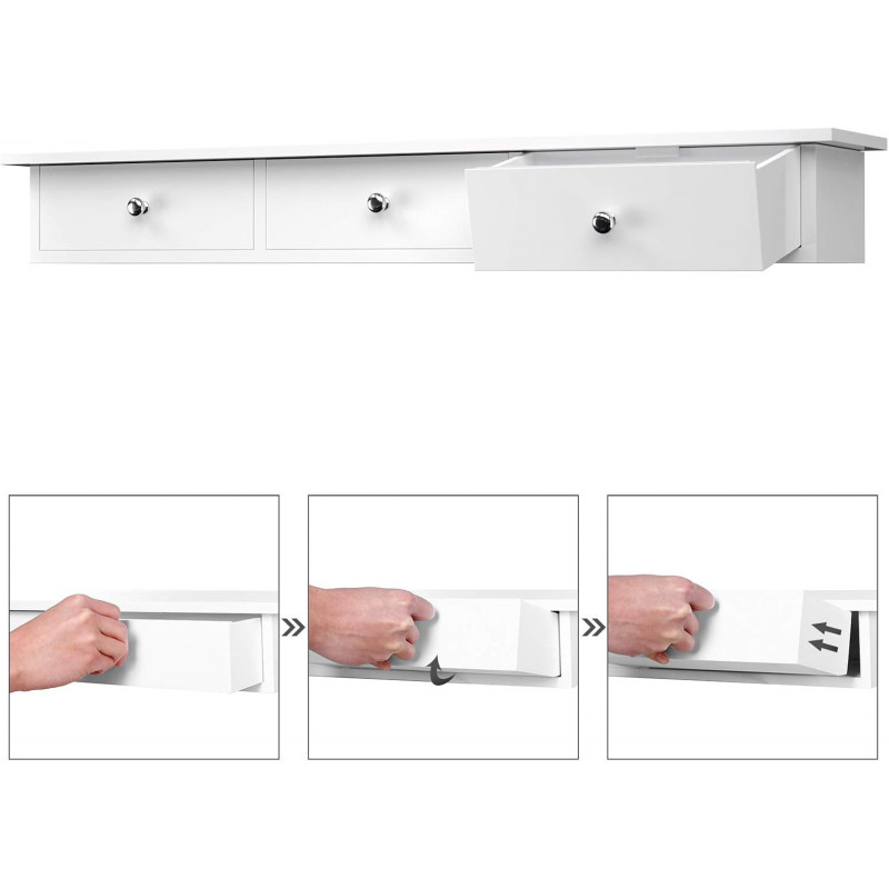 Capacitate de incarcare statica: 15 kg Despre acest articol Pentru a preveni caderile, sertarele sunt echipate cu opritori. In plus, acest raft de perete este durabil, deoarece este fabricat din lemn de inginerie de clasa E1 si acoperit cu vopsea lucioasa.La intrare pentru chei, in sufragerie pentru rame foto sau sub o oglinda pentru a crea un spatiu trendy... Depinde de dumneavoastra!Nu necesita asamblare. Acest raft plutitor este gata chiar din cutie. Pur si simplu atasati la perete cu suruburile si feroneria de agatat furnizate.
