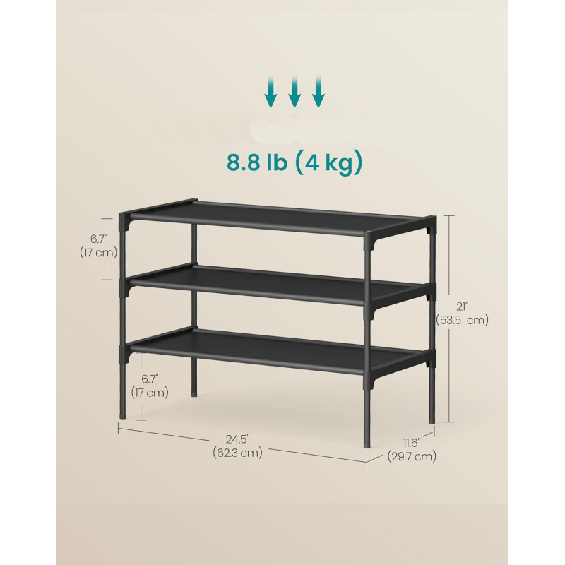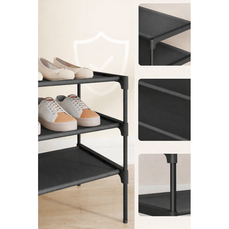 Scurta descriere Raftul pentru pantofi SONGMICS cu 3 niveluri este o solutie practica si compacta pentru organizarea incaltamintei in hol, dressing sau dormitor. Structura usoara dar stabila, realizata din cadru metalic si rafturi textile rezistente, ofera spatiu suficient pentru depozitarea mai multor perechi de pantofi, mentinand incaperile ordonate si aerisite.