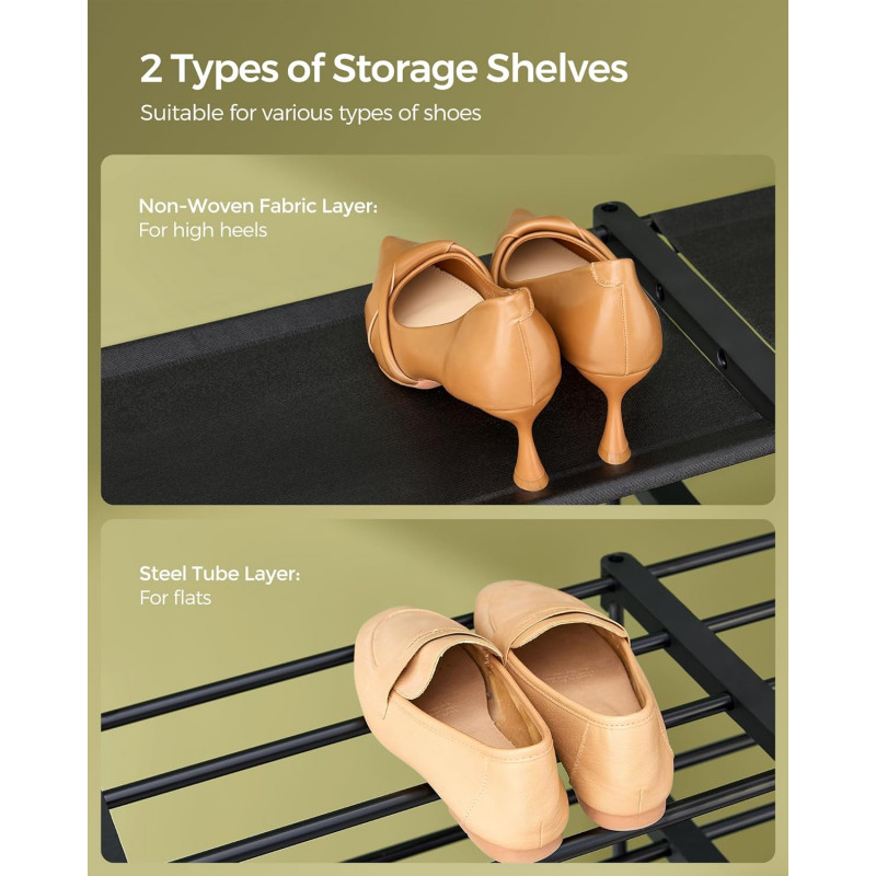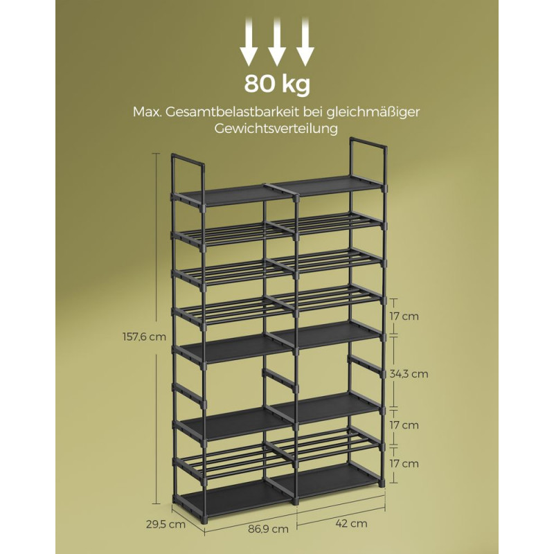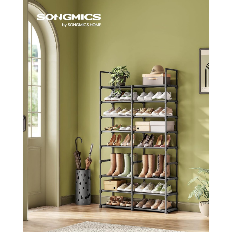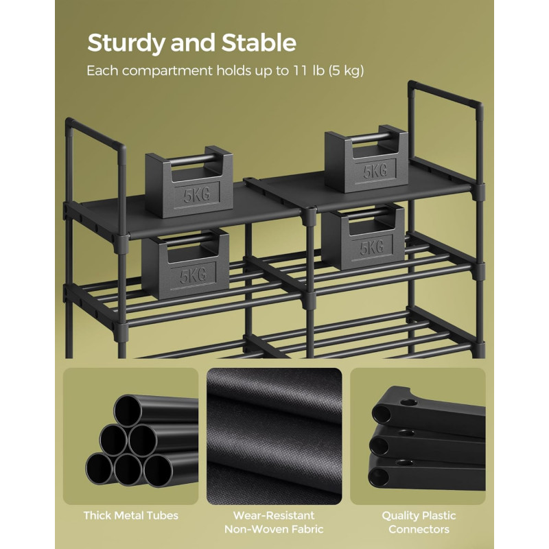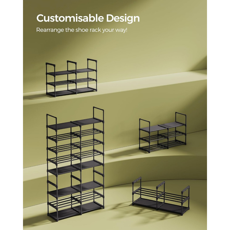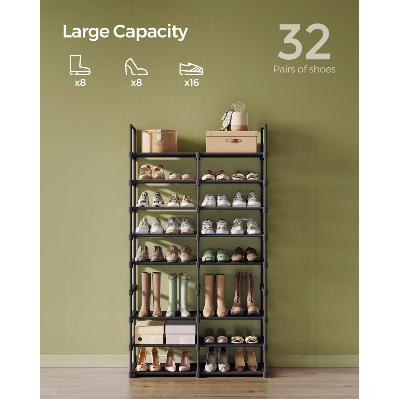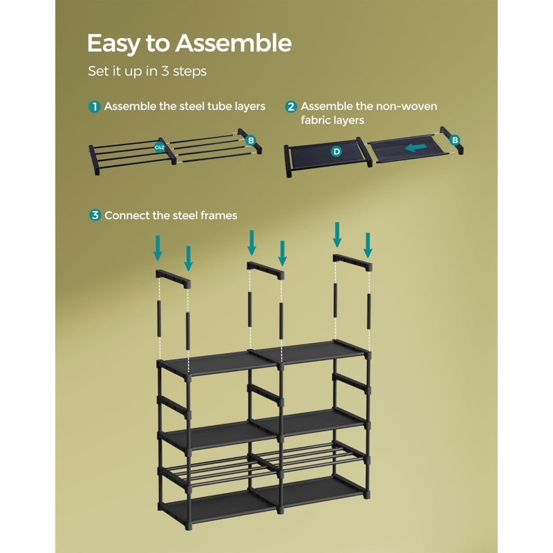 instructiunile pentru a verifica numarul de piese, asigurand cantitatea corecta.In timpul asamblarii, bateti usor conectorii cu ciocanul mic inclus pentru a va asigura ca piesele sunt bine asamblate.Distribuiti sarcina in mod egal pentru a evita orice risc de rasturnare.Va rugam sa nu puneti raftul pentru pantofi intr-un mediu umed pentru o perioada lunga de timp. Design adaptabil Reglati aspectul raftului pentru pantofi pentru a se potrivi cu inaltimea articolelor dvs. Acesta poate fi impartit in 2 sau mai multe rafturi. Personalizati-l pentru a va satisface nevoile personale, fie intr-un dulap, garaj sau debara! Spatios si versatil Acest organizator de pantofi cu 8 niveluri poate gazdui pana la 32 de perechi de pantofi, oferind un spatiu amplu de depozitare. Dincolo de pantofi, acesta poate servi, de asemenea, ca un raft de depozitare convenabil pentru cutii si pungi, sporind functionalitatea sa generala Robust si stabil Construit cu tuburi de otel de inalta calitate si tesatura rezistenta la uzura, acest suport durabil pentru pantofi suporta pana la 5 kg pe compartiment. Kitul anti-basculare inclus asigura ca raftul ramane stabil si previne clatinarea 2 tipuri de rafturi de depozitare Acest raft pentru depozitarea pantofilor are straturi de tesatura netesuta pentru pantofi cu toc inalt si genti si straturi de tuburi de otel pentru pantofi plati si cutii. Fiecare articol isi va gasi locul pe acest raft versatil! Usor de asamblat Fara suruburi! Cu designul sau simplu si