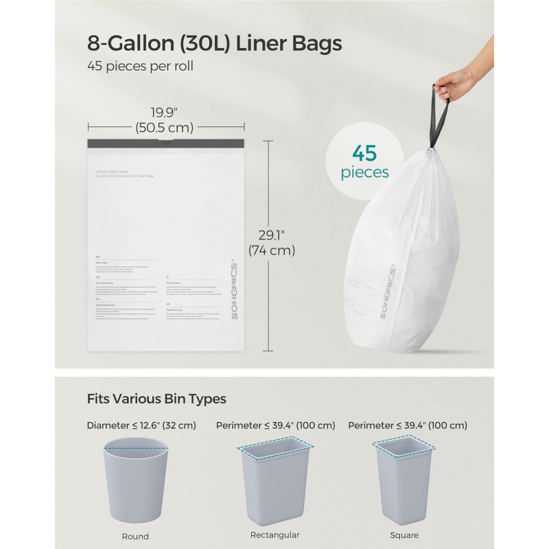 Include 2 role a cate 45 de saci, in total 90 bucati Despre acest articol Fabricat din polietilena groasa de 20 μm, corpul fiecarui sac de gunoi este suficient de rezistent pentru a sustine pana la 20 kg. Acestea sunt concepute pentru a rezista la rupturi, scurgeri si perforari, astfel incat nu va trebui sa va faceti griji cu privire la sacul care se destrama.Acesti saci de gunoi rezistenti exceleaza in diverse roluri, de la impachetarea bunurilor in timpul unei mutari la depozitarea hainelor in timpul unei mari curatenii sau colectarea frunzelor in timpul taierii plantelor. Ele sunt utile pentru o gama larga de sarcini.Pur si simplu trageti de corzile de pe ambele parti pentru a strange sacii de gunoi si pentru a elimina gunoiul. Snururile prind marginea cosului de gunoi fara a aluneca si, de asemenea, inchid frumos si strans sacul pentru a prinde mirosurile respingatoare.Aceste pungi de gunoi au o dimensiune de 52 x 74 cm si un volum de 30 L. Sunt livrate in doua role de 45 de bucati si au codul 30 A.