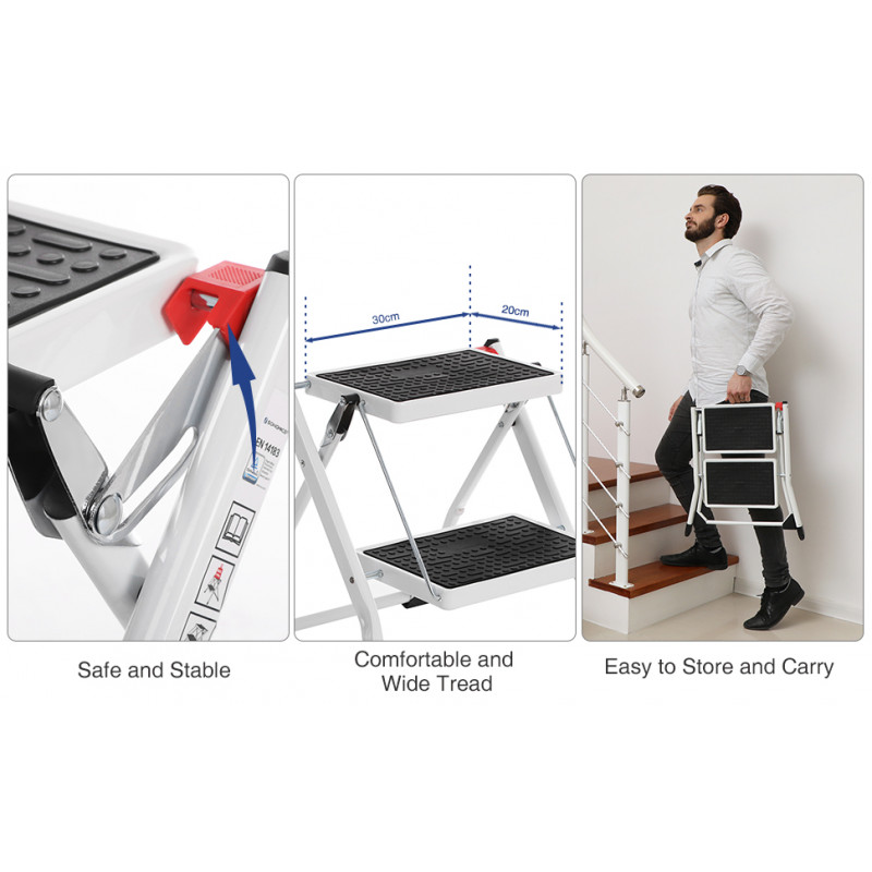 Ce primiti: O scara pliabila cu 2 trepte, usoara si compacta, cu un maner de transport pentru diferite treburi casnice.