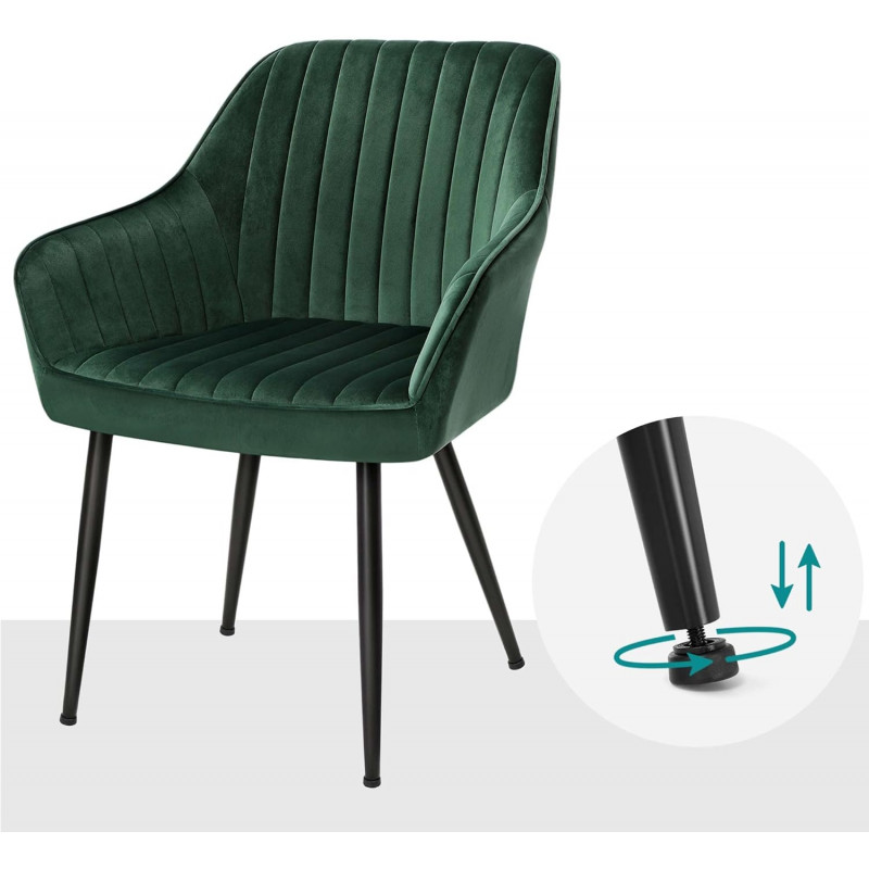 Foarte puternic: Cu cat scaunul este mai stabil, cu atat te poti relaxa mai linistit. Datorita picioarelor metalice incrucisate intarite cu suruburi si picioarelor reglabile, scaunul nostru este foarte stabil (pana la 120 kg).Totul pentru confortul tau: spatar si cotiere inclinate confortabil - scaunul ergonomic iti sustine corpul in mod optim. Suprafata de catifea placut moale, captuseala sezut cu grosimea de 7 cm, sezutul cu latimea de 49 cm - scaunul asigura confort ridicat.O nota de eleganta: suprafata matlasata de catifea in verde si picioare metalice in negru cerneala - scaunul tapitat emana eleganta si ofera casei tale o nota moderna.Usor de asamblat: sunt necesari doar 2 pasi. Pur si simplu strangeti cele 5 suruburi, un scaun este disponibil in doar cateva minute. Astfel economisiti mult timp si efort!Un plus important - versatilitate: scaunul se potriveste in diferite incaperi - in sufragerie sau in bucatarie ca scaun de sufragerie, in dormitor ca scaun de machiaj, in zona de receptie ca sezlong.