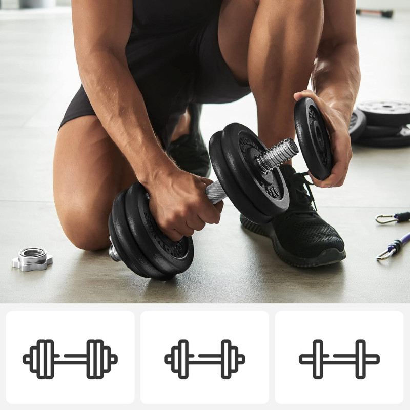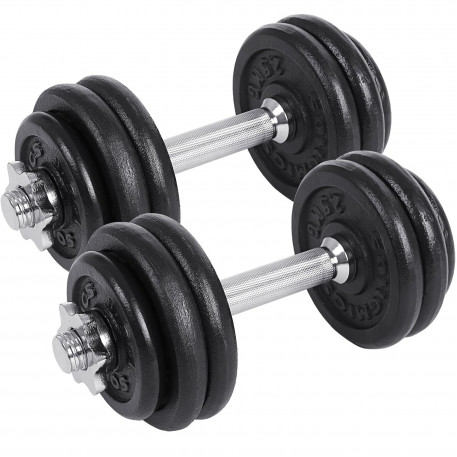 Scurta descriere Set de 2 gantere reglabile din fonta cu bare din otel galvanizat si prindere anti-alunecare. Permite combinarea discurilor pentru a adapta greutatea in functie de tipul de exercitiu.