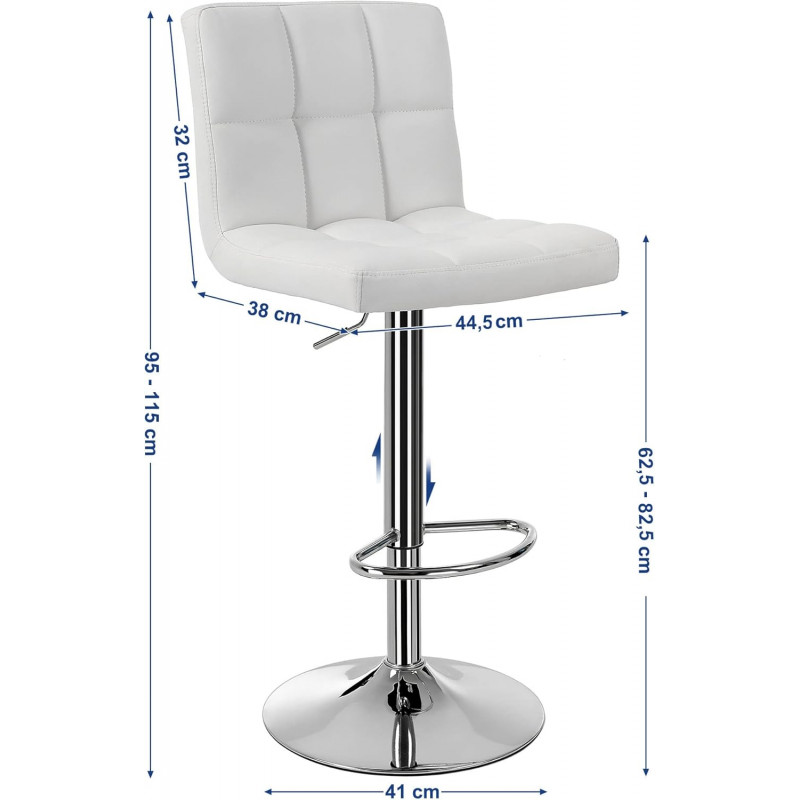 Scurta descriere Setul SONGMICS include 2 scaune de bar elegante, cu sezut tapitat PU si cadru robust din otel cromat. Reglabile pe inaltime, cu rotatie completa de 360°, ofera confort sporit datorita spatarului, suportului pentru picioare si pernei din spuma groasa. Cu baza lata si cilindru de siguranta, sustin pana la 120 kg, fiind o alegere functionala si moderna pentru orice bucatarie sau zona de bar.