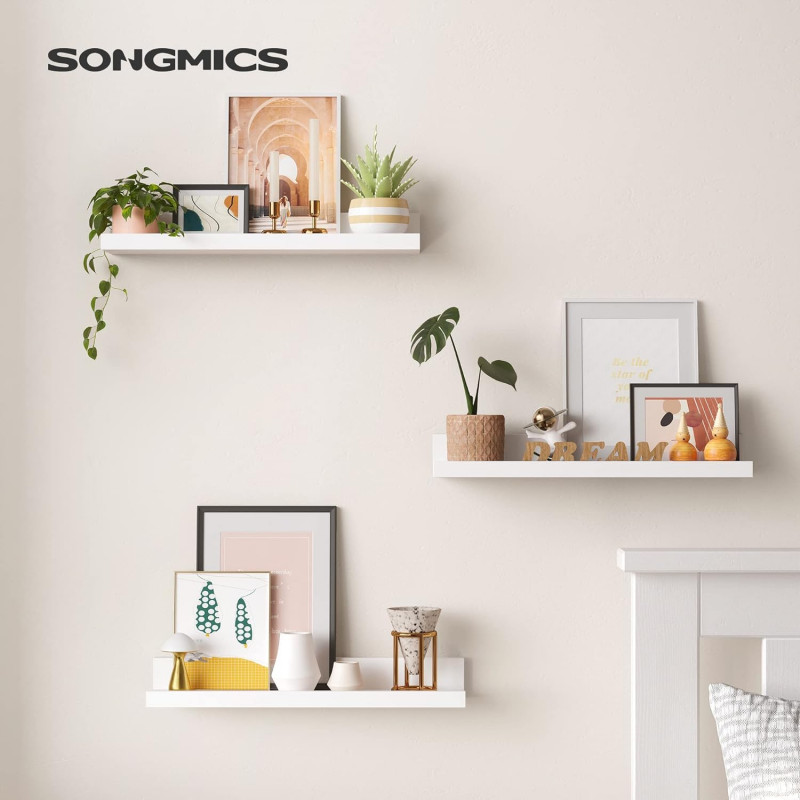 Numar rafturi: 3 Despre acest articol Cu suprafete albe lucioase, aceste 3 rafturi de perete uimitoare pot fi combinate in diferite moduri pentru a adauga caracter peretilor, oferind in acelasi timp spatiu pentru a afisa decoratiuni sau fotografii.Rafturile plutitoare sunt fabricate din placi aglomerate de inalta calitate si sunt puternice, robuste si durabile. Fiecare raft de perete poate rezista la o greutate de pana la 5 kg. Marginea frontala de 2 cm a rafturilor de perete va protejeaza obiectele de alunecare.Instalare usoara: Pur si simplu gauriti in perete, instalati rafturile cu suruburile furnizate si gata. De asemenea, sunt incluse