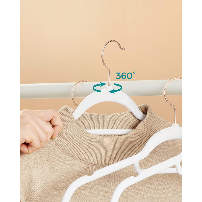 Scurta descriere: Acest set de 30 de umerase SONGMICS este ideal pentru o garderoba bine organizata si eleganta. Umerasele subtiri, dar rezistente, economisesc spatiu si sunt acoperite cu catifea antialunecare, pentru a pastra hainele in stare perfecta. Carligul metalic rotativ permite o utilizare usoara, iar bara centrala este practica pentru accesorii precum cravate sau esarfe.