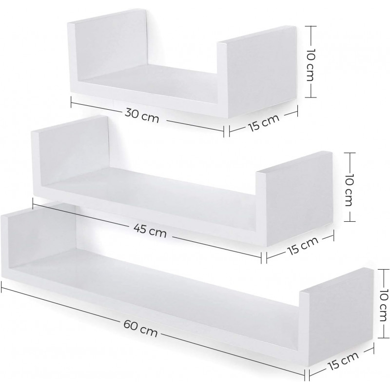 Sarcina statica a fiecarui raft: 10 kg Despre acest articol Cu suprafete albe lucioase, aceste 3 rafturi de perete uimitoare pot fi combinate in diverse moduri pentru a adauga caracter peretilor goi, oferind in acelasi timp spatiu pentru a expune decoratiuni sau fotografii.Rafturile plutitoare fabricate din placi aglomerate de inalta calitate sunt puternice si durabile. Fiecare raft de perete poate sustine pana la 10 kg.Panourile laterale ale acestor rafturi protejeaza cartile, CD-urile si DVD-urile de cadere, oferind un postament mai sigur.Pur si simplu faceti gauri in perete, instalati rafturile cu suruburile furnizate si gata. De asemenea, sunt incluse