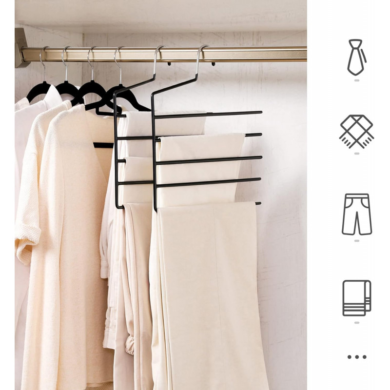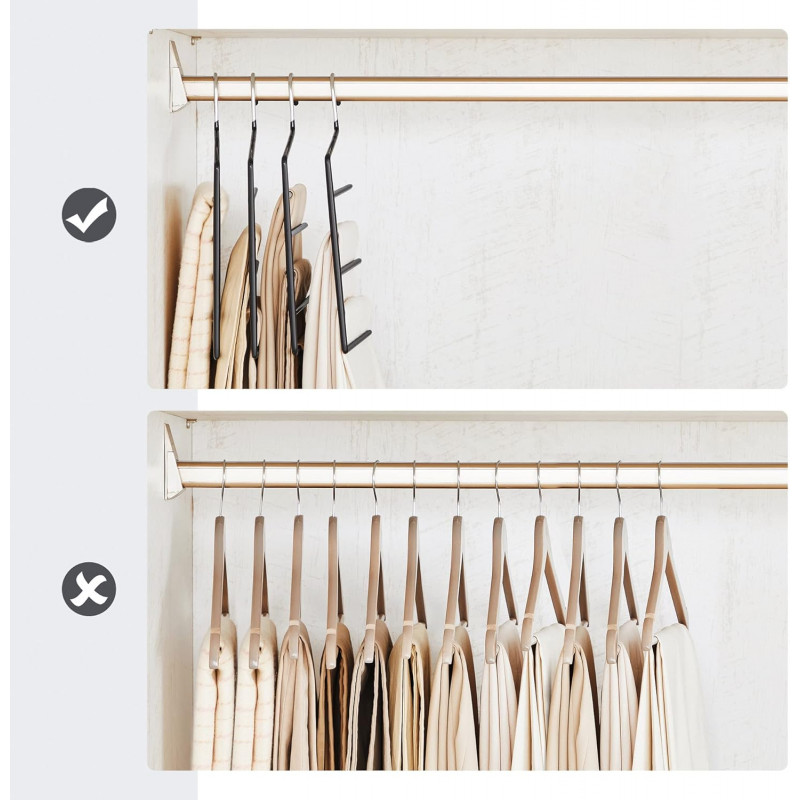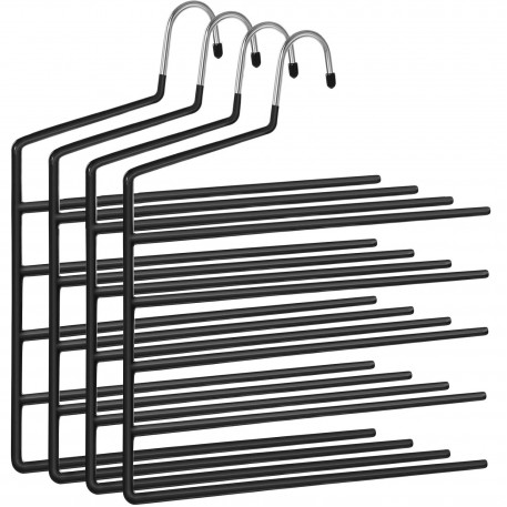 Max. Capacitate de incarcare statica per umeras: 4 kg Despre acest articol Pantalonii sunt ascunsi printre grupuri de haine, iar esarfele si prosoapele se pierd adesea in dezordine. Preia controlul asupra haosului cu acest set de 4 umerase cu bare multiple, mentinandu-le ordonate si intr-un singur loc.Pantalonii delicati par destinati sa ajunga pe podeaua dulapului tau, provocand acea gramada de temut? Acoperirea din PVC de pe fiecare bara va ajuta sa preveniti acest incident enervant si ridurile rezultate.Fabricat din metal solid, fiecare umeras poate sustine pantaloni care cantaresc pana la 5 kilograme.