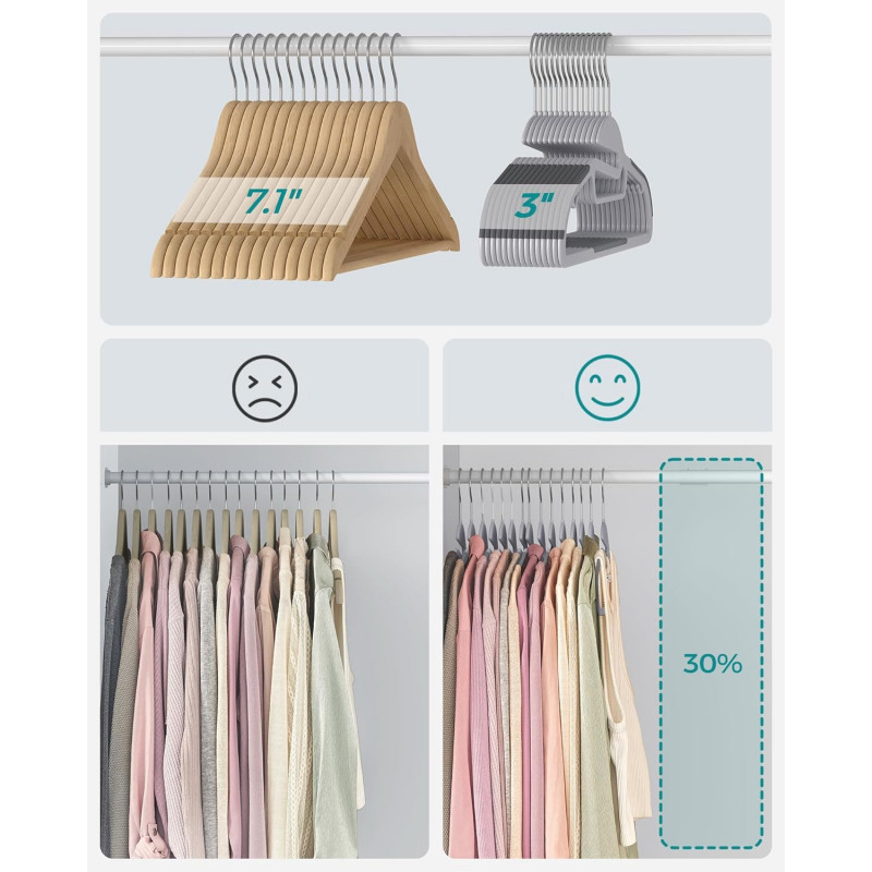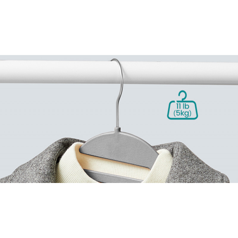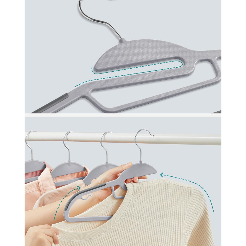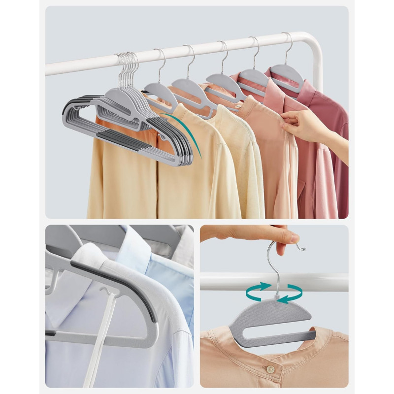 Antialunecare: Invelisul de cauciuc de pe umeri si bara inferioara impiedica alunecarea hainelor; carligele laterale mici sunt concepute pentru agatarea sutienelor sau a rochiilor spaghetti. Carlige pivotante la 360 °: Carligele metalice de inalta calitate de pe umerase se rotesc la 360 ° pentru agatarea si accesul usor la hainele dvs.