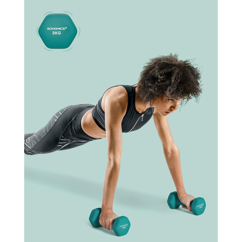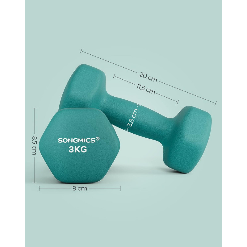Scurta descriere: Setul de gantere SONGMICS este potrivit pentru antrenamente de forta, tonifiere si cardio acasa. Forma hexagonala ofera stabilitate, iar acoperirea din vinil asigura o prindere confortabila si sigura in timpul exercitiilor.