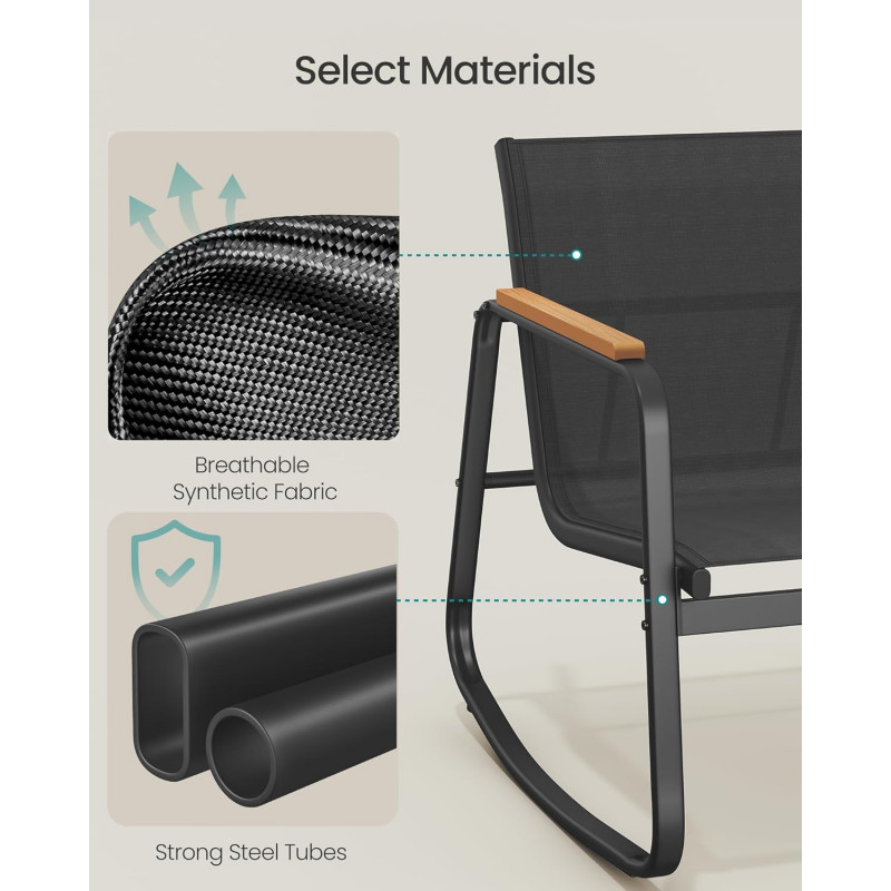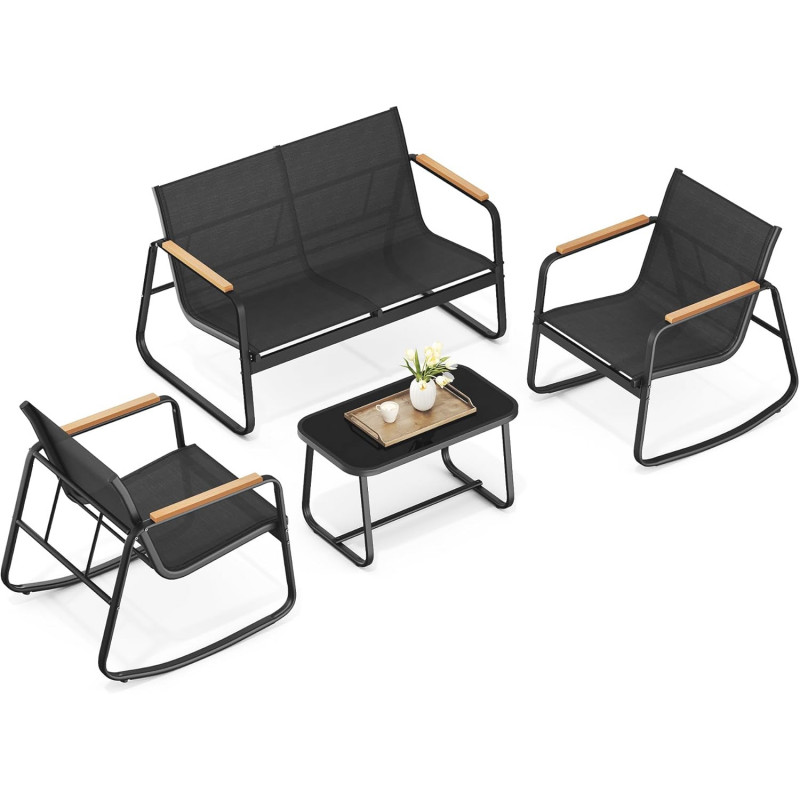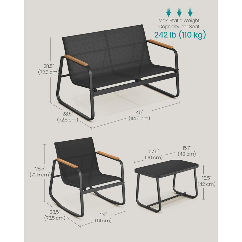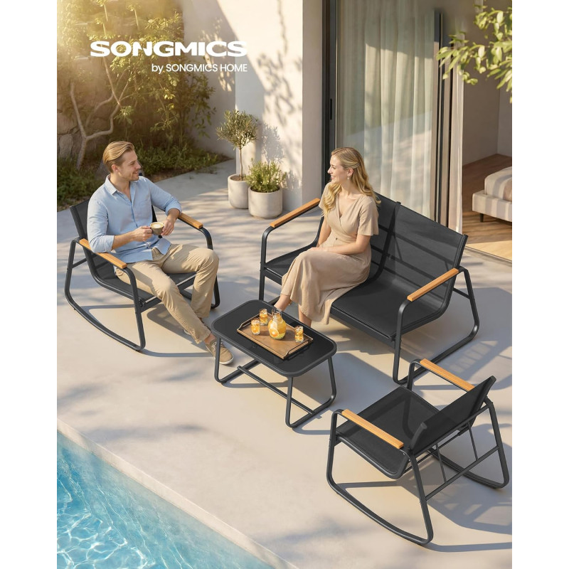 Scurta descriere Setul de mobilier pentru gradina SONGMICS cu 4 locuri este ideal pentru momente de relaxare alaturi de familie sau prieteni. Include doua scaune balansoar, o canapea confortabila si o masa practica, fiind perfect pentru terasa, balcon sau gradina. Designul modern si materialele rezistente asigura durabilitate si confort in utilizare.