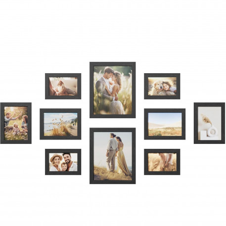 Set compus din 10 rame foto in 3 dimensiuni: 2 mari (28x24 cm), 4 medii (21x16 cm), 4 mici (18x13 cm)