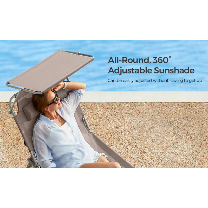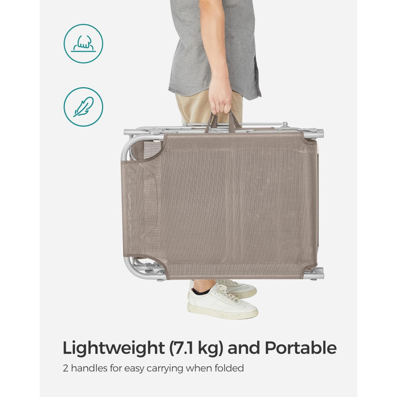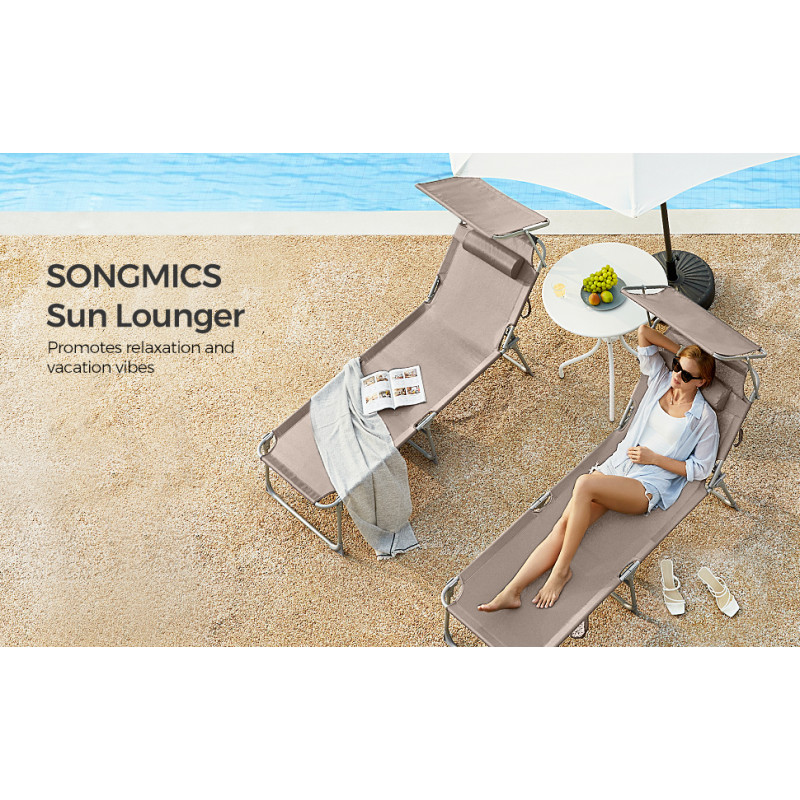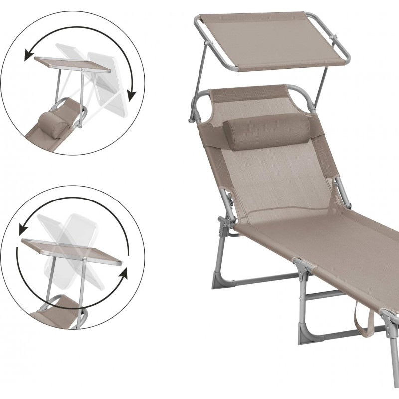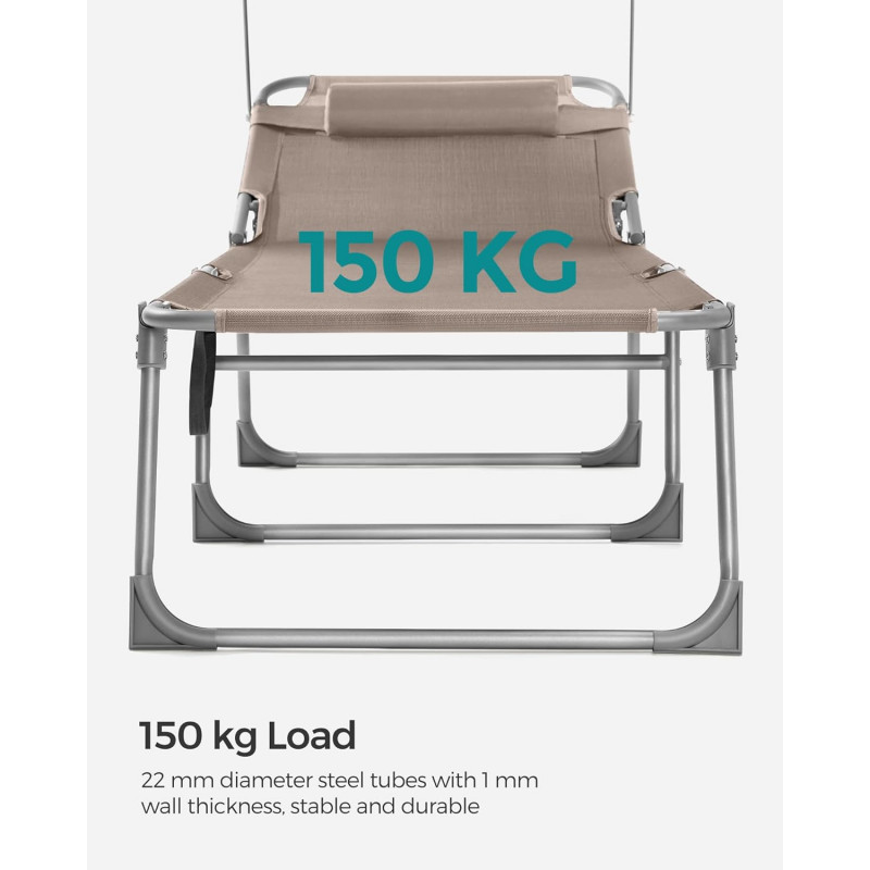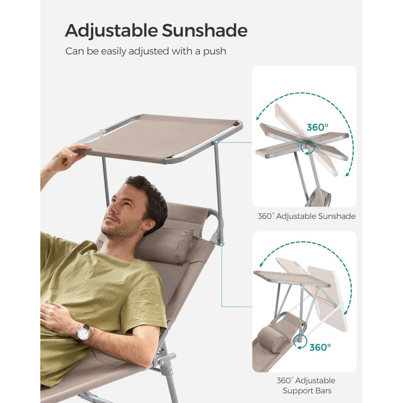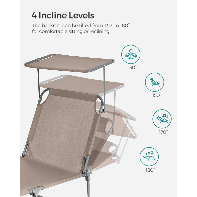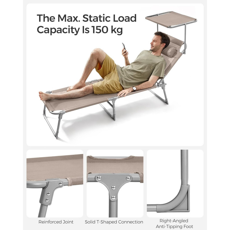 Capacitate de sarcina statica: 150 kg Despre acest articol Atunci cand este pliat, acest sezlong masoara doar 17 x 53 x 73 cm, ceea ce il face convenabil de adus la piscina sau pe terasa. Cele doua manere il fac usor de transportat.Acest sezlong are un spatar reglabil cu 4 pozitii de inclinare si o tetiera detasabila. Pur si simplu reglati-l in pozitia preferata.Acest sezlong, cu o tesatura sintetica respirabila, impiedica umezeala sa se ataseaze de scaun. Relaxati-va in voie, chiar si in timpul celor mai fierbinti zile de vara. Acest sezlong are o umbrela de soare, care va permite sa cititi reviste in curte in timp ce va bucurati de soare. Puteti regla cu usurinta unghiul parasolarului cu mana, fara a fi nevoie sa va ridicati.Acest sezlong solid, cu cadrul sau din otel acoperit cu pulbere si articulatiile intarite, poate sustine pana la 150 kg si ramane stabil datorita picioarelor antiderapante.