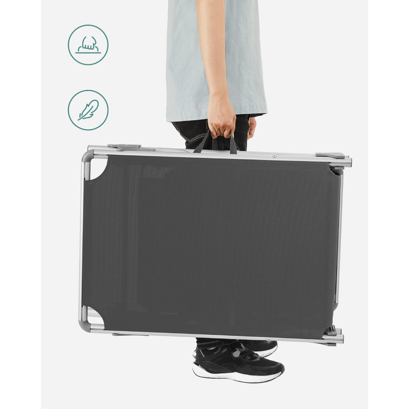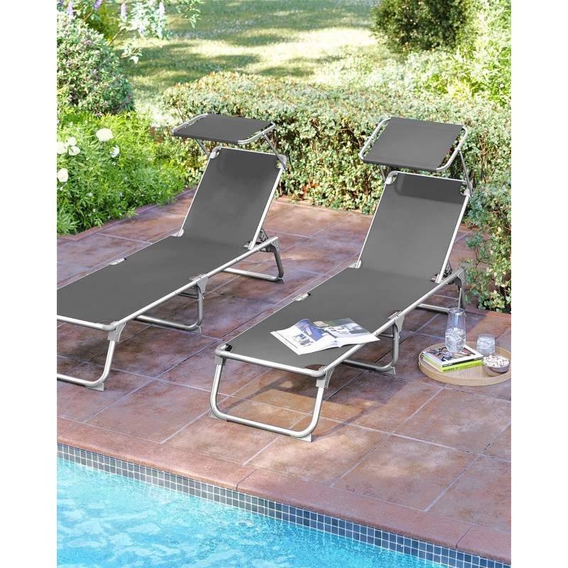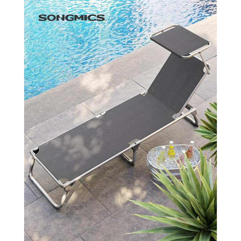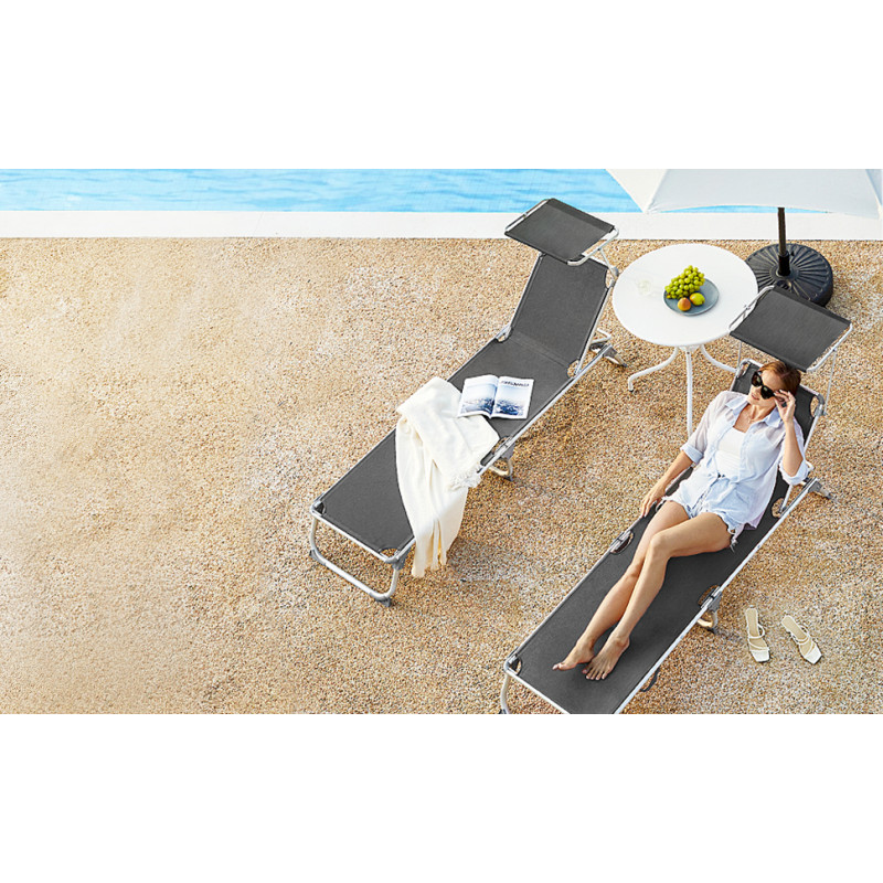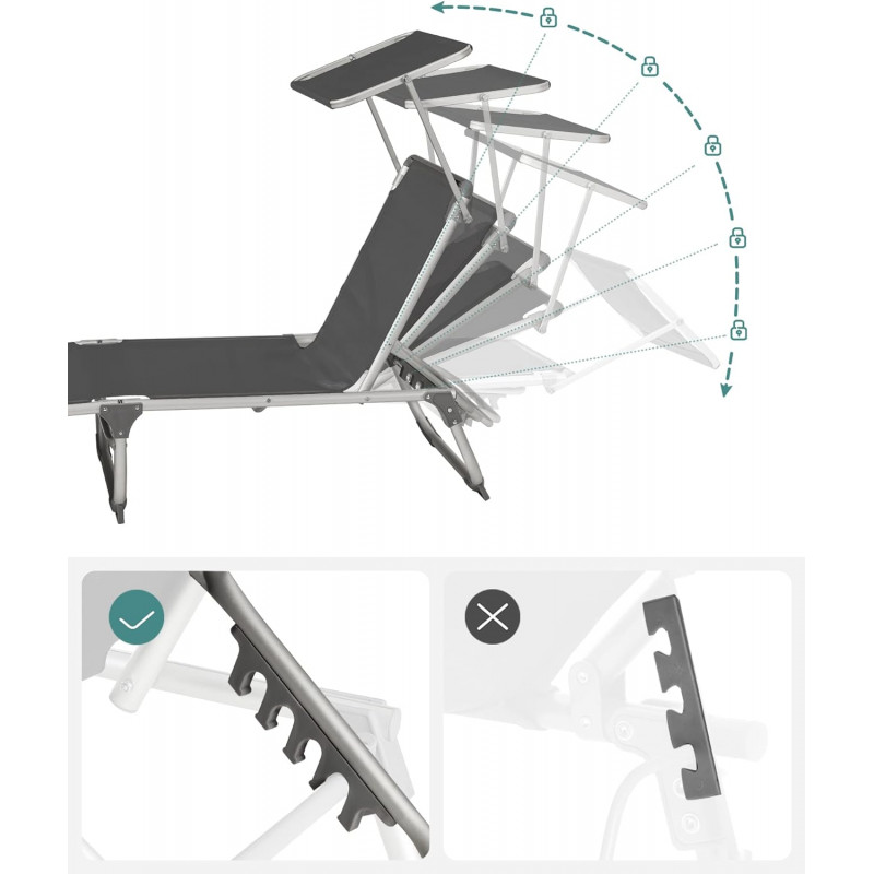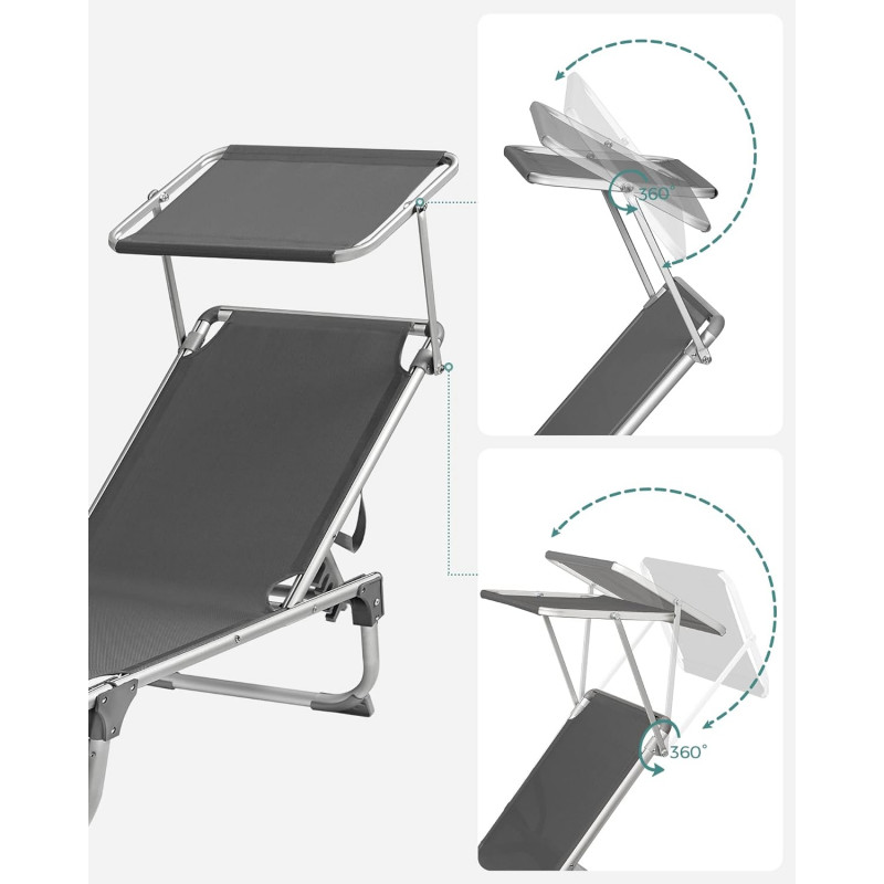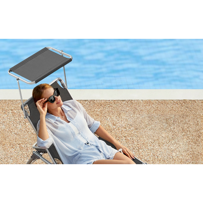 Capacitate de incarcare statica: 150 kg Despre acest articol Atunci cand este pliat, acest sezlong masoara doar 55 x 193 x 31 cm, ceea ce il face convenabil de adus la piscina sau pe terasa.Cele doua manere il fac usor de transportat.Acest sezlong are un spatar reglabil si un parasolar detasabil. Pur si simplu reglati-l in pozitia preferata.Acest sezlong, cu o tesatura sintetica respirabila, impiedica umezeala sa se ataseaze de scaun. Relaxati-va in voie, chiar si in timpul celor mai fierbinti zile de vara. Acest sezlong are o umbrela de soare, care va permite sa cititi reviste in curte in timp ce va bucurati de soare. Puteti regla cu usurinta unghiul parasolarului cu mana, fara a fi nevoie sa va ridicati.Acest sezlong solid, cu cadrul sau din otel acoperit cu pulbere si articulatiile intarite, poate sustine pana la 150 kg si ramane stabil datorita picioarelor antiderapante.
