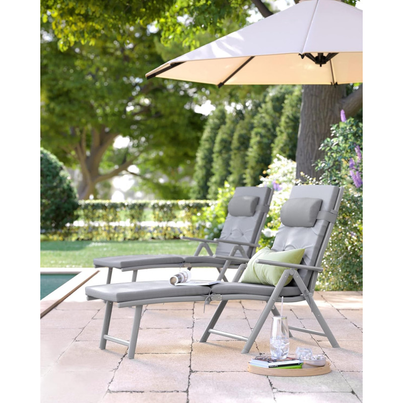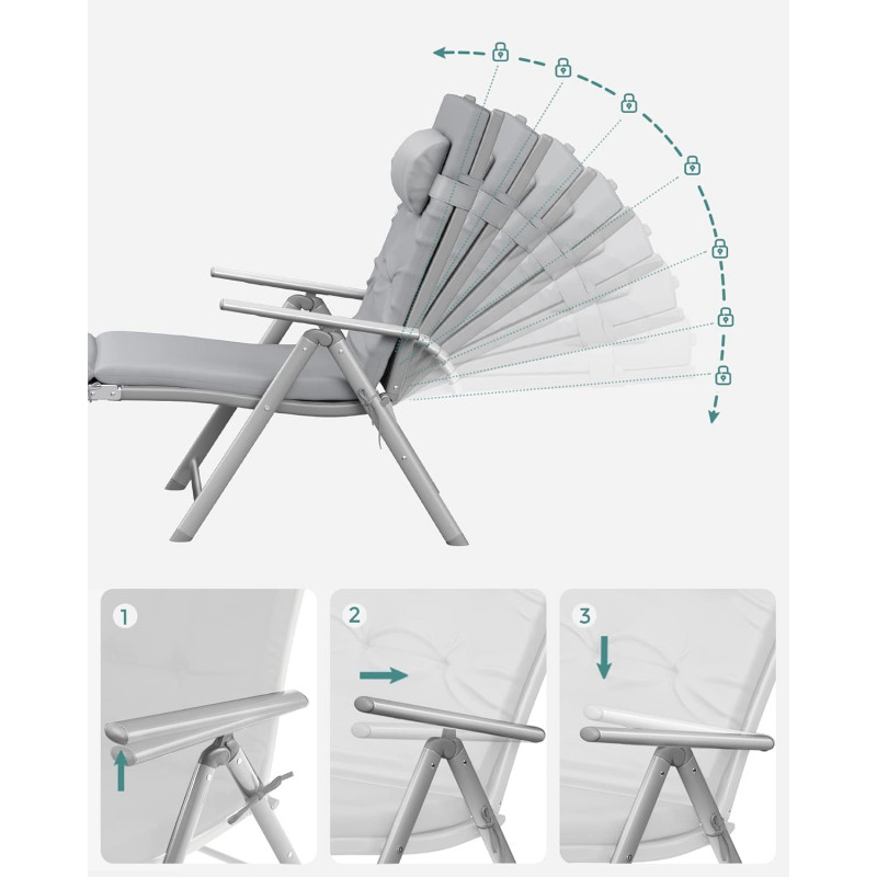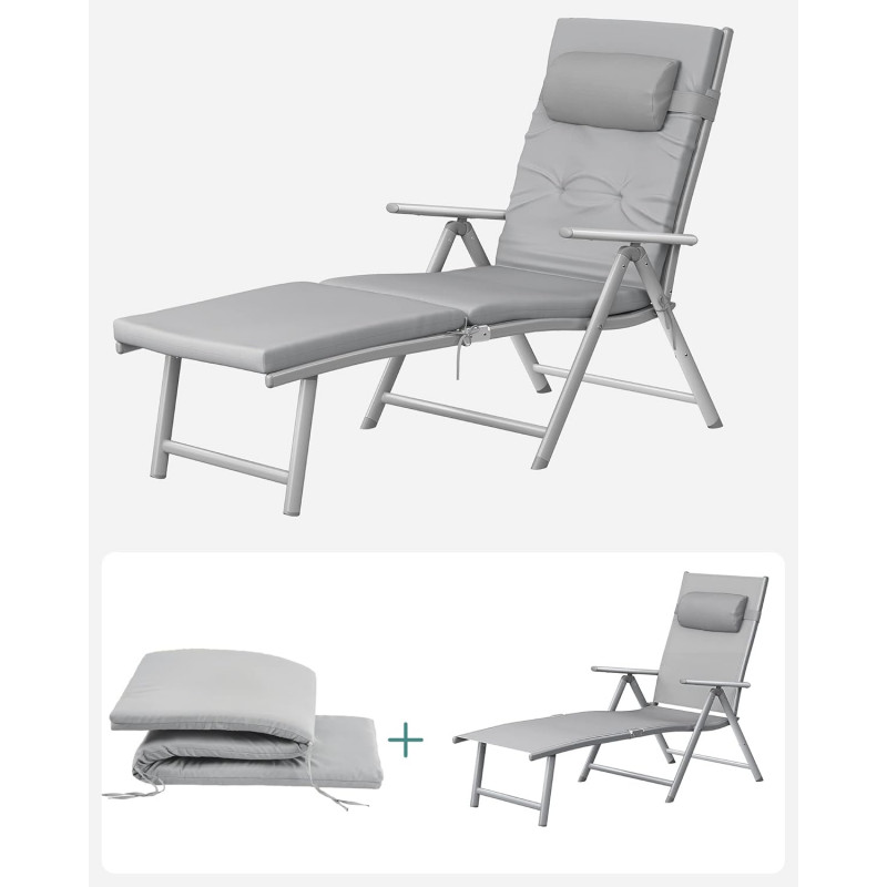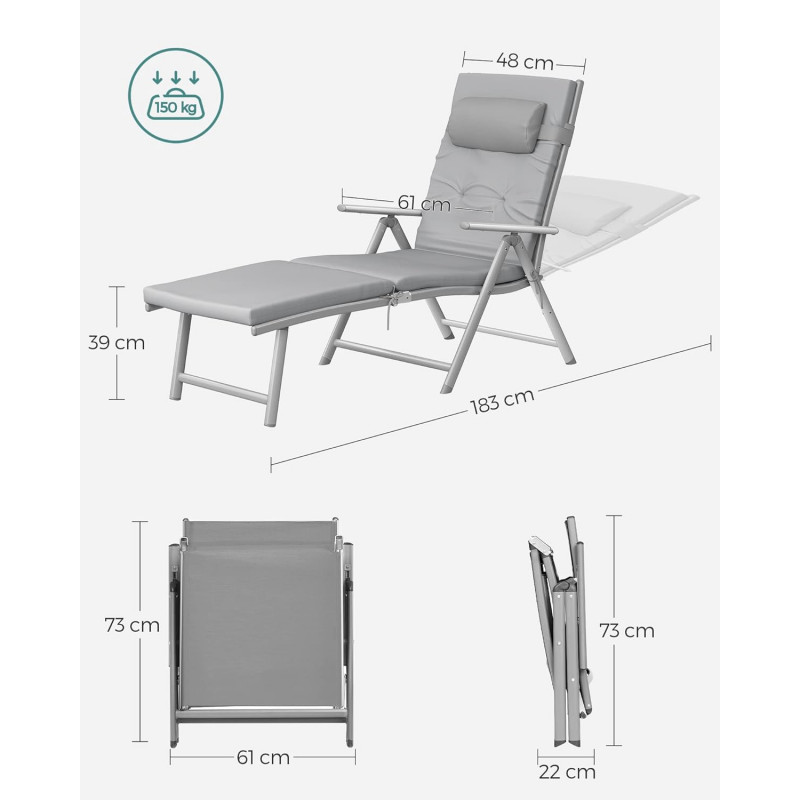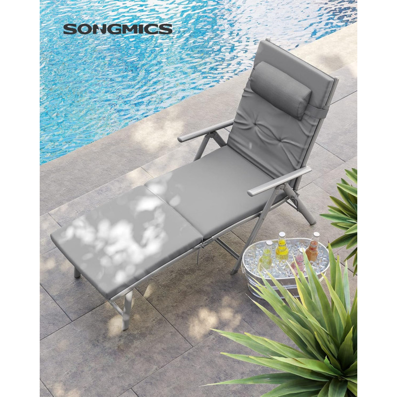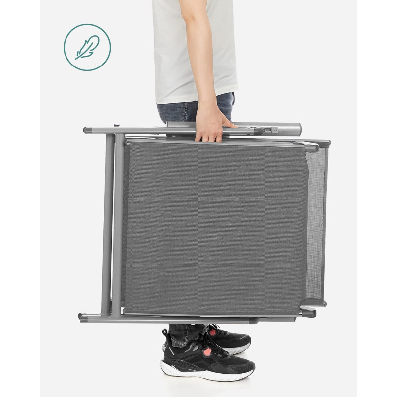 Scurta descriere Sezlongul pliabil SONGMICS ofera un nivel superior de confort datorita saltelei groase de 6 cm si spatarului reglabil in 7 pozitii. Structura din aluminiu rezistent la rugina il face ideal pentru utilizare in exterior, iar designul pliabil il face usor de depozitat si transportat.