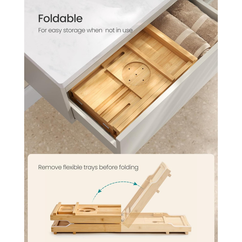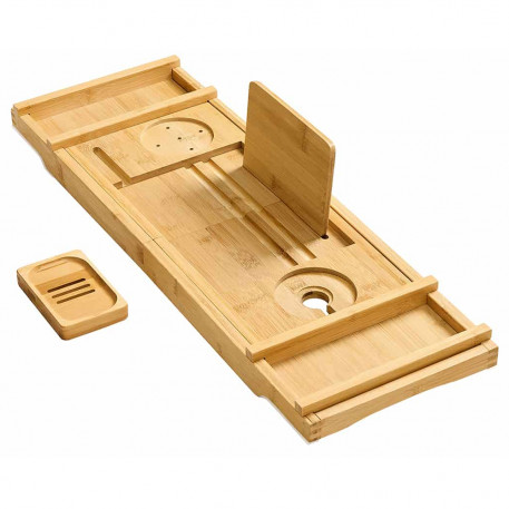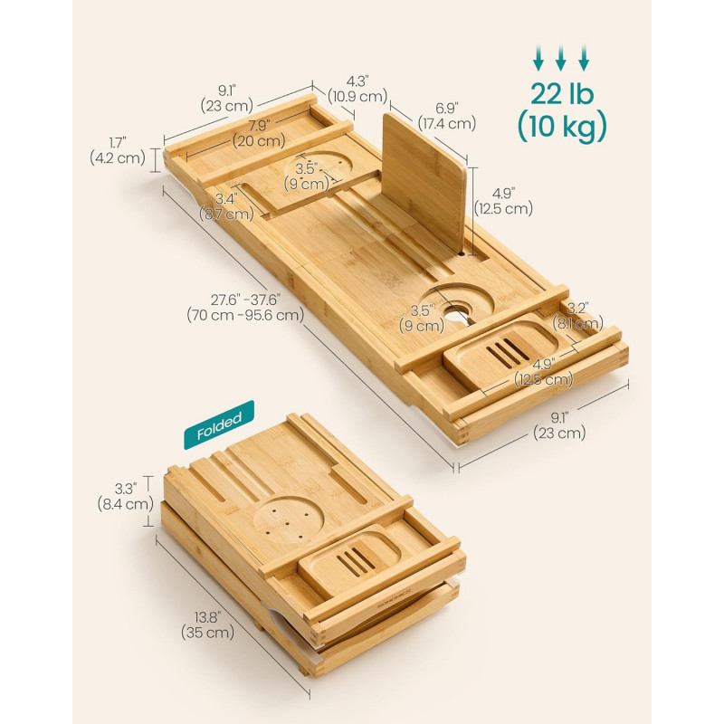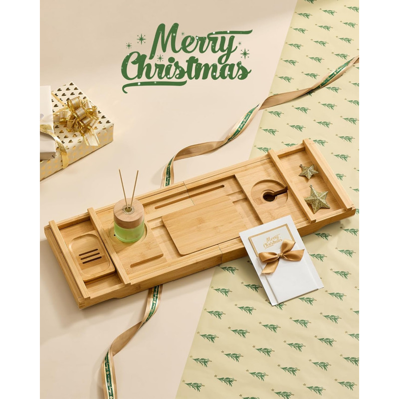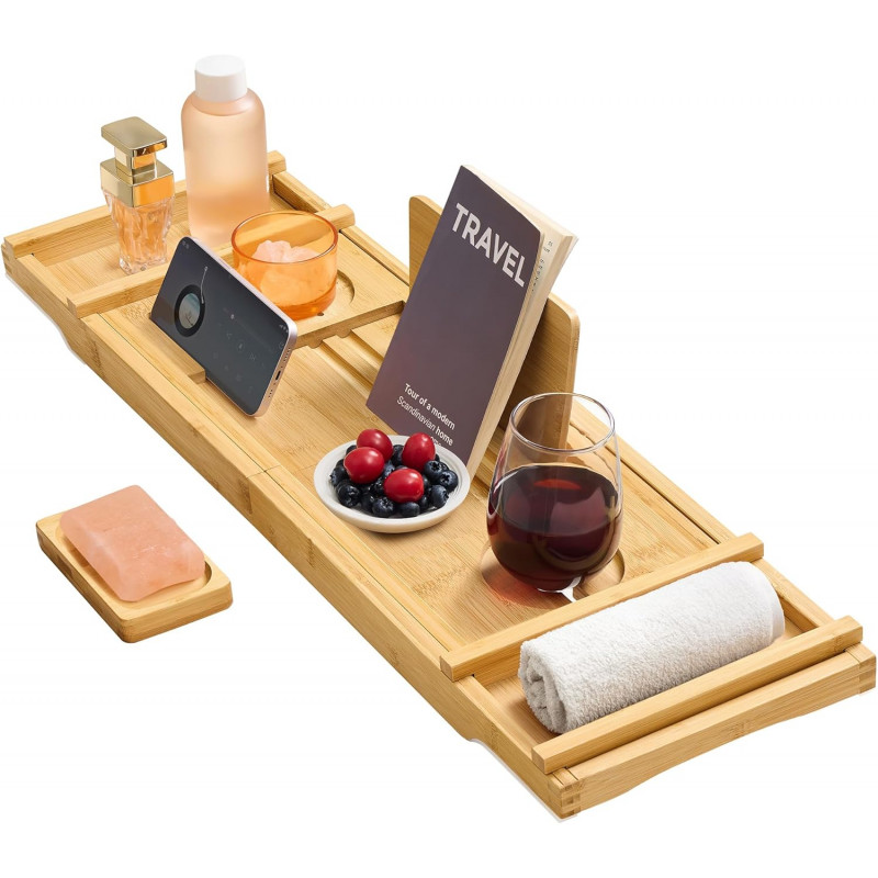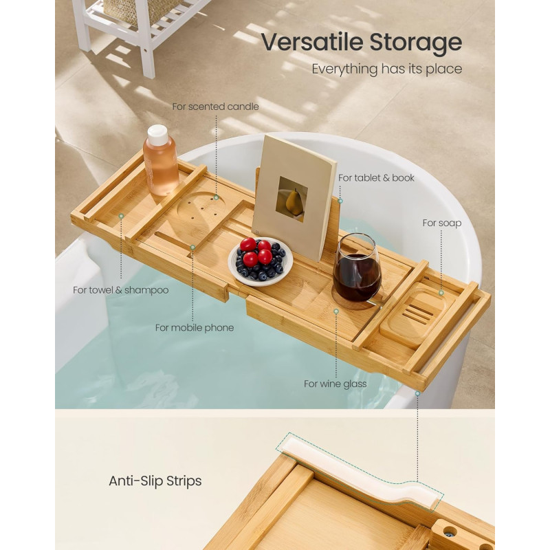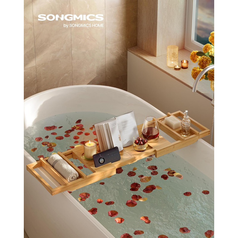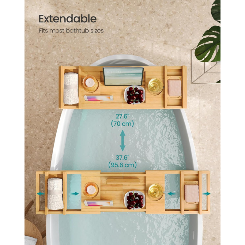 Scurta descriere Transforma-ti baia intr-o oaza de relaxare cu suportul extensibil pentru cada de la SONGMICS. Fabricat din bambus natural, acest suport inteligent se extinde pana la 95,6 cm pentru a se potrivi celor mai multe cazi. Include spatii dedicate pentru pahar de vin, tableta, telefon, carte, prosop si lumanare parfumata. Este pliabil si usor de depozitat, iar benzii antialunecare ii asigura stabilitatea in timpul folosirii.