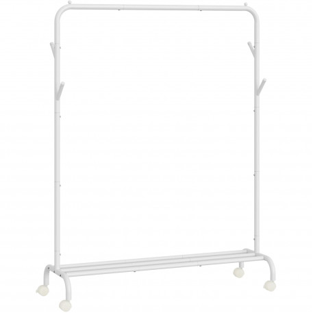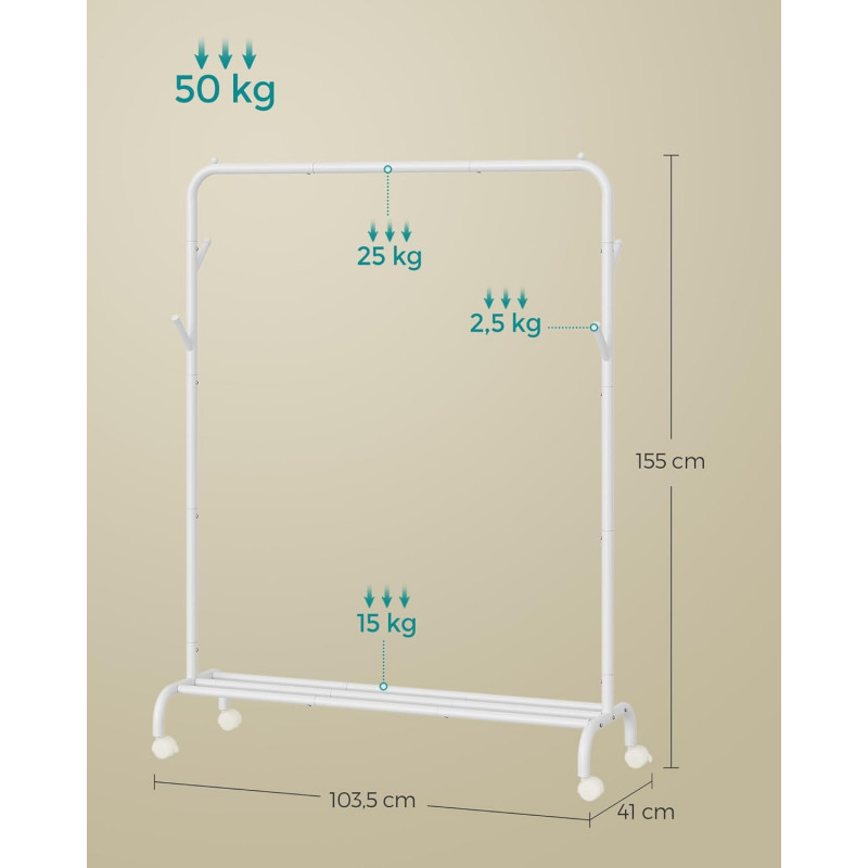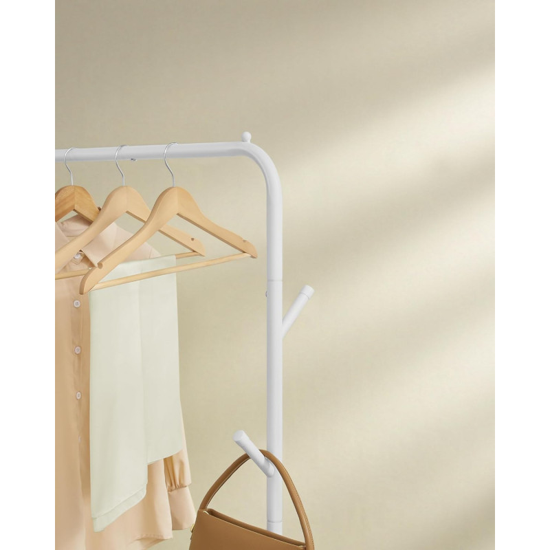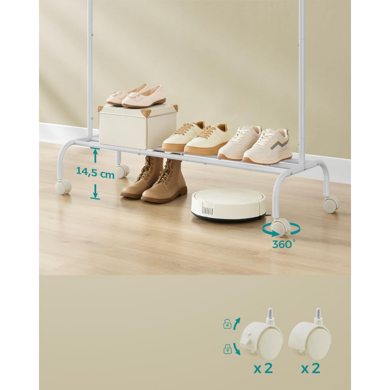 Scurta descriere: Suportul pentru haine SONGMICS este o solutie practica pentru organizarea eficienta a garderobei. Bara superioara permite agatarea hainelor de diferite lungimi, iar raftul inferior ofera spatiu suplimentar pentru cutii sau incaltaminte. Datorita rotilor pivotante, suportul poate fi mutat cu usurinta oriunde este nevoie.