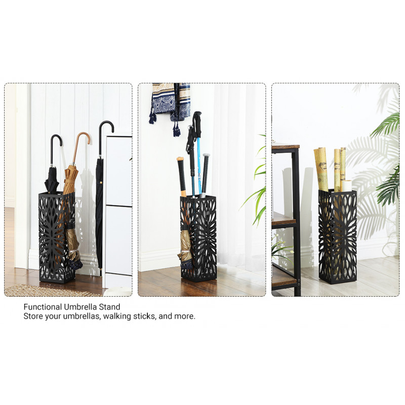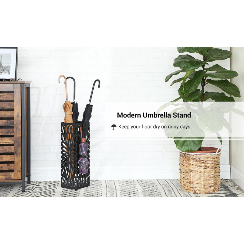 Greutate neta: 2 kg Despre acest articol Mai mult decat un simplu loc pentru a va organiza si usca umbrelele in zilele ploioase, acest suport de umbrele cu decupaje cu tematica de ploaie confera un aspect artistic pentru o intrare mai primitoare.Nu lasati picaturile de ploaie de la umbrele sa va strice podeaua si dragostea pentru zilele ploioase; opriti-le cu ajutorul tavii de scurgere din acest suport pentru umbrele si apoi bucurati-va de zi – intindeti-va cu o carte sau nu faceti nimic altceva decat sa ascultati ploaia.Acest suport de 15.5 x 15.5 x 49 cm ofera suficient spatiu pentru umbrelele dvs. lungi. Dar asta este doar o parte din el! Cele 4 carlige va permit, de asemenea, sa agatati umbrelele dvs. mici pliabile, astfel incat sa nu se adune in partea de jos.Acest suport de umbrele din metal de calitate asigura un nivel ridicat de stabilitate, chiar daca puneti inauntru mai multe umbrele lungi, role de hartie, bastoane sau alte obiecte.
