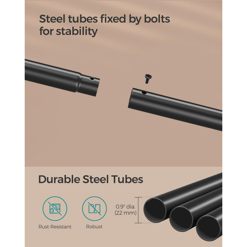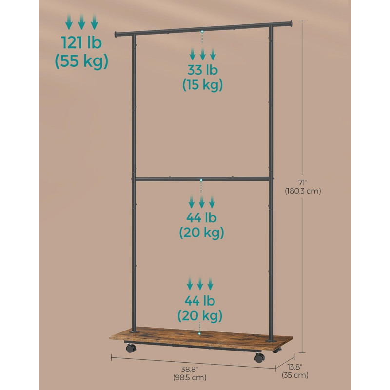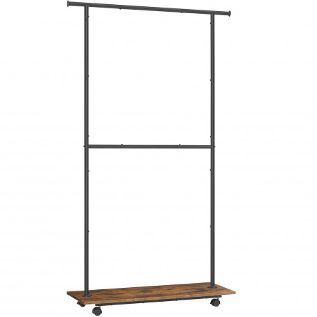 Capacitate de incarcare statica maxima: 55 kg Despre acest articol Reglati sina din mijloc intre 2 inaltimi diferite (in timp ce inaltimea totala ramane fixa), atarnati paltoane sau rochii lungi pe sina superioara si depozitati pantofi sau genti pe raftul inferior. Este o solutie unica pentru toate nevoile dvs. de depozitare.Cu 4 rotite universale, dintre care 2 sunt blocabile, puteti muta cu usurinta acest suport portabil pentru haine din dormitor in dulap si il puteti bloca in loc daca este necesar. Fabricat din tuburi de otel durabile si placi aglomerate de inalta calitate, acest suport reglabil pentru haine este construit pentru a dura. Tija de sus poate sustine pana la 30 kg, iar tija din mijloc si raftul de jos pot sustine fiecare 20 kg.Cu un cadrul sau din otel negru si raftul maro rustic, acest suport pentru haine emana un vibe industrial retro. Este un accesoriu practic, dar elegant pentru orice.