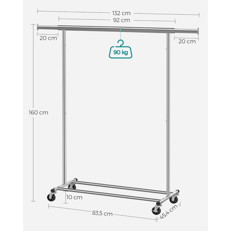 Capacitate de incarcare sporita: Datorita tuburilor de otel cu grosimea de 1 mm, care sunt mai groase si mai rezistente decat cele normale, cu grosimea de 0,8 mm, si rotilor din PP rezistente, acest suport pentru haine suporta pana la 90 kg. Asa ca nu ezitati sa va atarnati paltoanele grele!Sina de suspendare extensibila: Fiecare capat al sinei superioare se extinde cu inca 20 cm pentru a va oferi mai mult spatiu pentru agatat (sina de sus se extinde de la 92 cm la 132 cm); cele 2 capete extensibile sunt, de asemenea, ideale pentru a agata gentile, palariile, esarfele sau alte accesorii pe