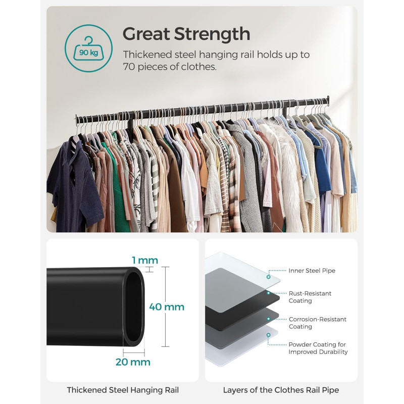 Utilizare versatila: Aceasta bara pentru haine vine cu 2 bare inferioare pentru cutiile de depozitare, facandu-l functional, fie in dormitor sau in garderoba pentru a depozita articolele zilnice, fie in spalatorie pentru a usca hainele. Otelul acoperit cu pulbere permite, de asemenea, utilizarea in exterior