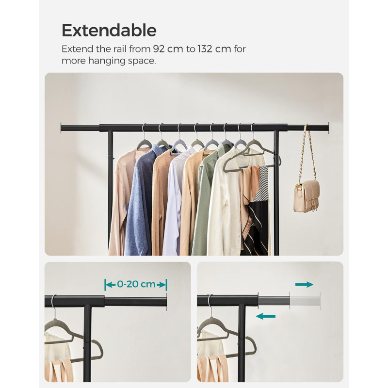 Capacitate de incarcare sporita: Datorita tuburilor de otel cu grosimea de 1 mm, care sunt mai groase si mai rezistente decat cele normale, cu grosimea de 0,8 mm, si rotilor din PP rezistente, acest suport pentru haine suporta pana la 90 kg. Asa ca nu ezitati sa va atarnati paltoanele grele!Sina de suspendare extensibila: Fiecare capat al sinei superioare se extinde cu inca 20 cm pentru a va oferi mai mult spatiu pentru agatat (sina de sus se extinde de la 92 cm la 132 cm); cele 2 capete extensibile sunt, de asemenea, ideale pentru a agata gentile, palariile, esarfele sau alte accesorii pe